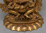 Introducing the Protector God Mahakala Statue, a strong guardian expertly fashioned from copper and embellished with stunning 24k gold plating. Standing at a height of 17.5cm, this beautiful statue exudes strength and heavenly protection, inspiring awe and devotion in those who see it.