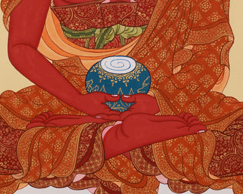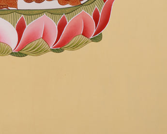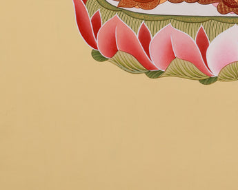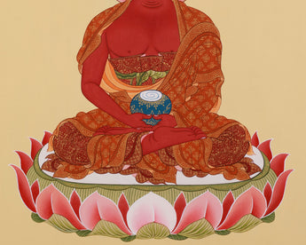 This Pure Land Amitabha Buddha Thangka depicts the Buddha of Infinite Light's calm and kind presence, which is revered for guiding beings to enlightenment and rebirth in the Sukhavati. He is portrayed in his luminous red form, signifying the transformative power of wisdom and boundless compassion. His serene demeanor is amplified by his gentle expression, which radiates compassion and knowledge. As he meditates, he holds a monk's bowl, symbolizing his capacity to provide peace and enlightenment. It signifies his ability to bestow tranquility and spiritual growth upon all living beings. The artwork is meticulously painted on cotton canvas in the traditional Tibetan style, employing authentic 24K gold and acrylic colors to enhance its beauty and spiritual significance.