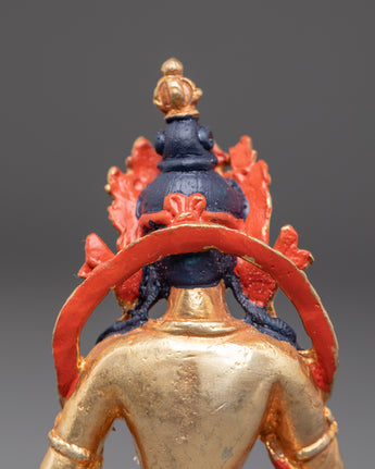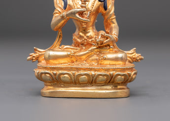The statue's details, such as the divine features on his face and the delicate folds of his robes, are accentuated by the gold-plated finish. The lotus foundation on which Vajrasattva sits represents the blossoming of wisdom and enlightenment, while his position represents cleansing. This statue is a sacred tool that helps with spiritual change, purification, and the removal of negative energies. It also makes a lovely adornment.