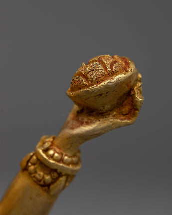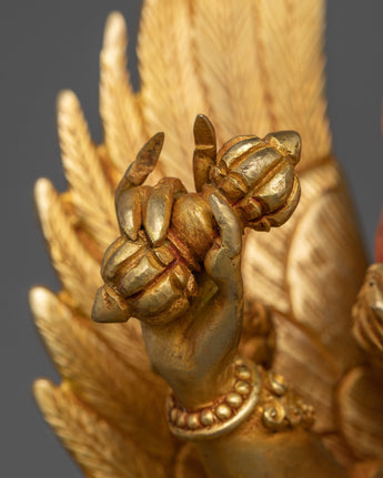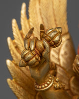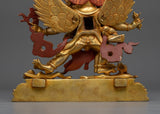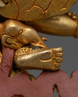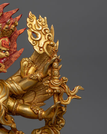 The Vajrakilaya Statue Dagger of Compassion, stands at a height of 12.2 inches (31 cm), with a base width of 10.8 inches (27.5 cm). This statue is crafted with a copper body, adorned with 24K gold gilding and vibrant gold and acrylic paintings, showcasing exquisite craftsmanship. The intricate detailing and radiant finish bring out the fierce yet compassionate essence of Vajrakilaya, symbolizing the deity's power to remove obstacles and purify negative forces.