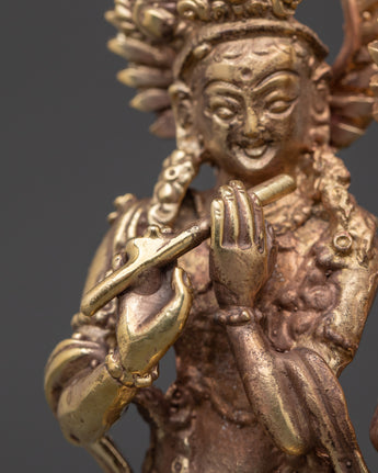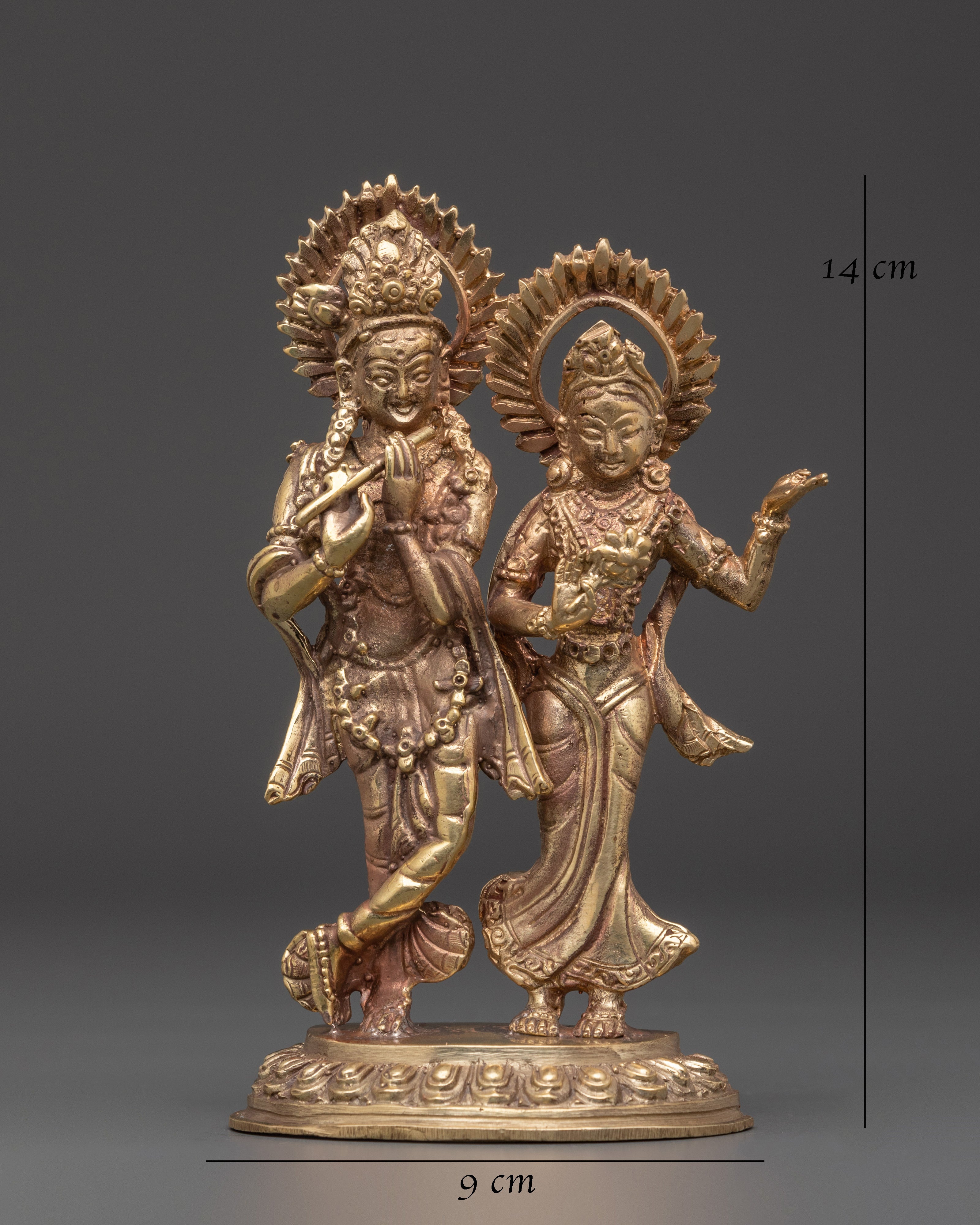 Celebrate the holy union of love and devotion with this gorgeous Radha Krishna brass sculpture, which is expertly made to symbolize the celestial lovers' lifelong link from Hindu mythology. This compact yet sturdy piece, measuring 14 cm in height and 9 cm in breadth, is ideal for both sacred settings and elegant décor. The sculpture depicts Lord Krishna gently playing his flute alongside Radha, representing perfect harmony, heavenly connection, and spiritual union. Its weight of 10.39 kg indicates its dense, sturdy construction, bringing lasting elegance and spiritual energy to your area.