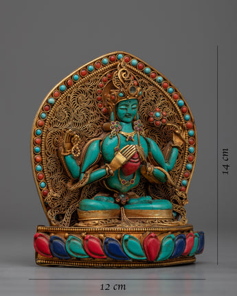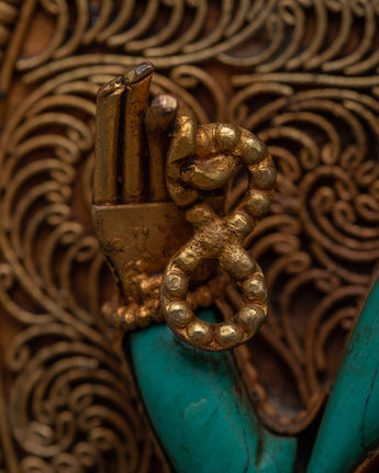 Presenting the exquisite Radiant Chenrezig Statue, a masterpiece of artistry and spirituality. Meticulously handcrafted on a copper body, this statue embodies the divine essence of Chenrezig, the embodiment of compassion and mercy. What makes this statue truly exceptional is the use of gemstones, carefully embedded into the copper body. These radiant gemstones add a captivating touch, bringing the statue to life with their vibrant colors and shimmering beauty. Every detail, from the serene expression on Chenrezig's face to the intricately crafted features, reflects the dedication and skill of the artisans. Invite the compassionate energy of Chenrezig into your space and let the radiant presence of this statue inspire and uplift your spirit.