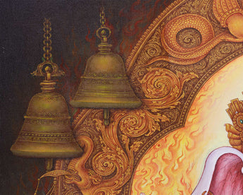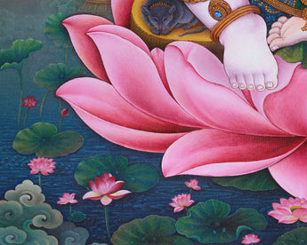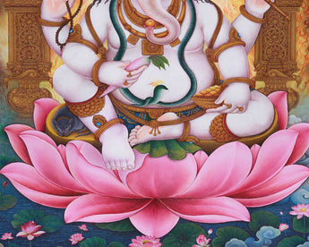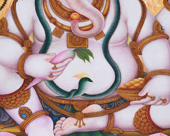 In this beautiful thangka, he is depicted with four arms, each holding meaningful symbols: a mala (prayer beads) for ongoing spiritual practice, a radish, which is a special Newar and Tantric symbol representing fertility and vitality, a modak sweet that stands for the rewards of devotion and inner happiness, and an axe to cut through ignorance and clear obstacles. He sits gracefully on a radiant lotus throne, surrounded by detailed florals and a golden halo that radiates divine energy. His kind yet powerful gaze, ornate crown, and flowing jewelry—adorned with shimmering gold—bring a sense of spiritual presence and artistic elegance. This thangka isn’t just a beautiful piece of art; it’s a sacred invitation for Ganesh’s protection, wisdom, and blessings for everyone who looks at it.
