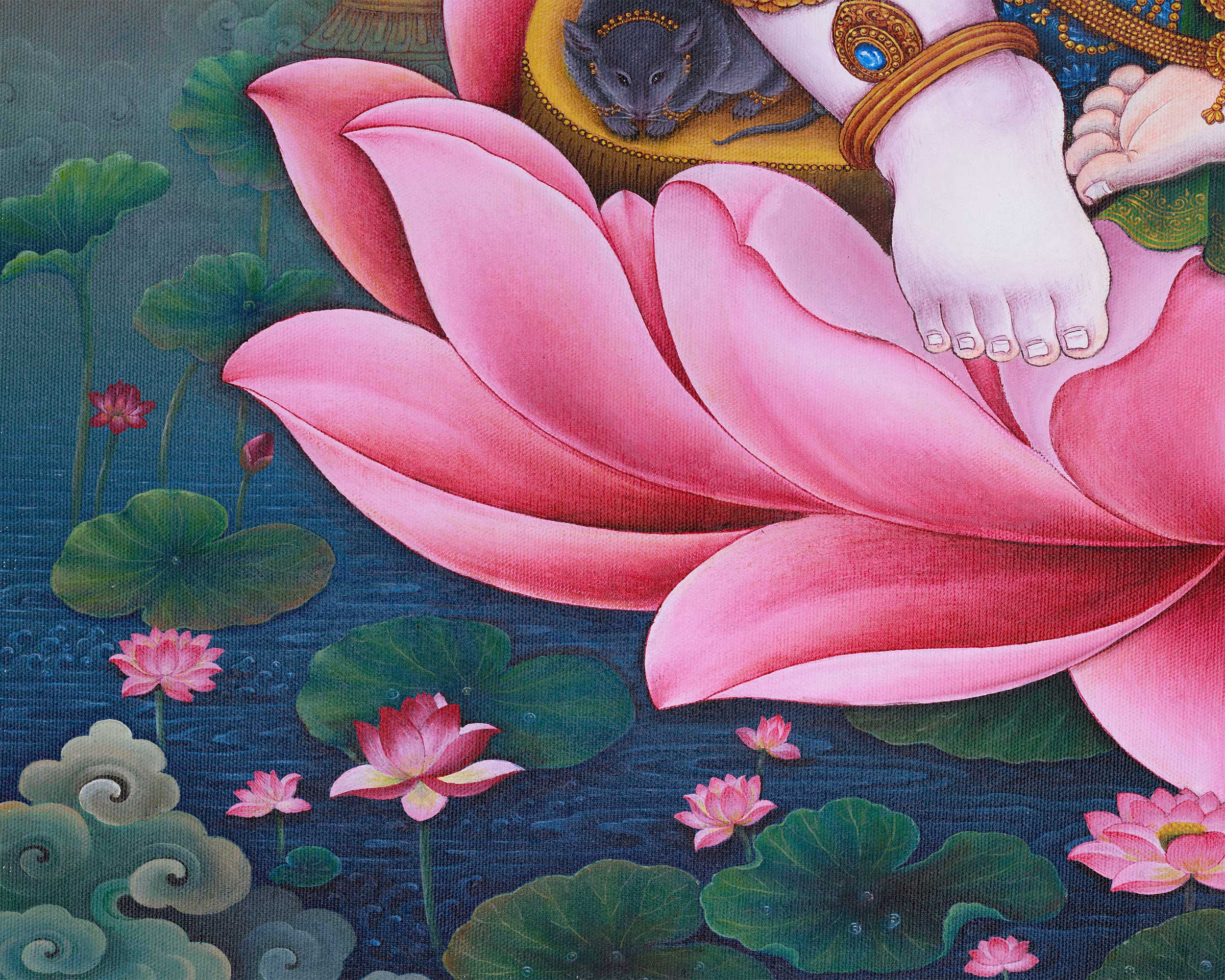 Radiating auspicious blessings and timeless artistry, this Lord Ganesh thangka elegantly displays sacred Himalayan workmanship. Hand-painted in the traditional Paubha style by a talented Nepali artist, it’s created on fine cotton canvas using rich acrylic pigments and enhanced with glowing 24K gold accents. Each step of its creation—from the intricate linework to the layering of vibrant colors, culminating in shimmering golden highlights—demonstrates incredible skill.