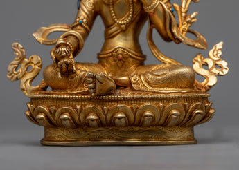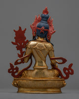 The sculpture is expertly crafted from a copper body, which was selected for its robustness and historical significance in the creation of holy items. The statue is then lavishly wrapped in 24K gold plating, which adds a sense of grandeur and purity to the warm tones of the copper. This gold layer not only enhances the sculpture's visual appeal but also symbolizes the divine energy and enlightened presence of Red Tara.
