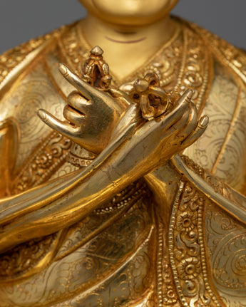 Introducing the Rangjung Rigpe Dorje, the 16th Karmapa Statue, an excellence that represents the enlightened leadership and profound spiritual legacy of one of Tibetan Buddhism's most cherished outstanding individuals. This 8.7-inch statue is crafted of high-quality copper and embellished with a brilliant layer of 24K gold gilding. The elaborate gold and acrylic paintings depict the Karmapa's dignified posture and meditative countenance, with each brushstroke conveying his great devotion to spiritual teachings and humanitarian beliefs.