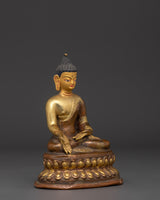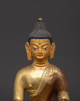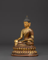 This gorgeous Ratnasambhara Buddha sculpture will bring the energy of abundance and generosity into your sacred area. Made of oxidized copper and plated in dazzling gold, it depicts the Buddhist deity of wealth and prosperity. Its copper body and fortunate gold shine make it an ideal addition to meditation altars, spiritual collections, or home décor.