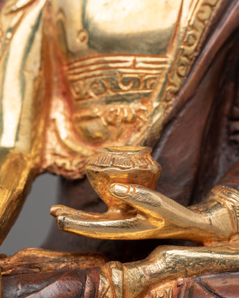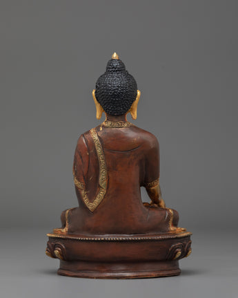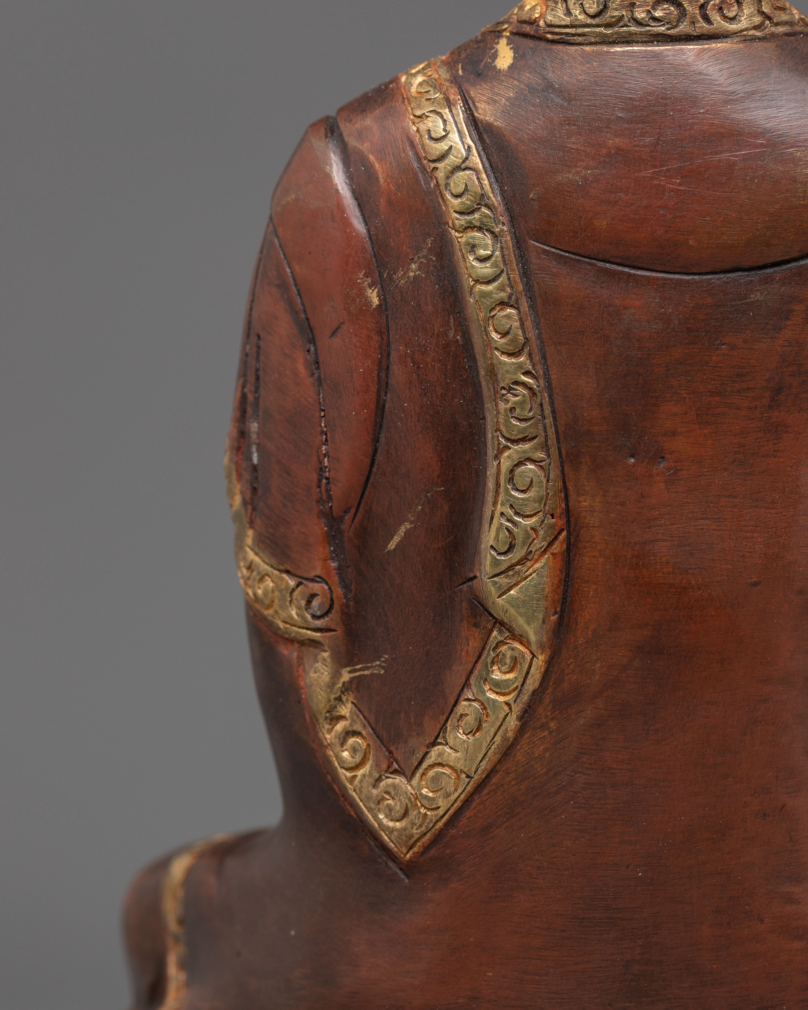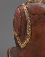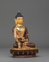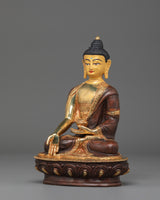 This wonderfully made Buddha statue exemplifies traditional Tibetan workmanship. The gold plating brightens the figure's appearance, while the copper base gives a solid foundation. Ratnasambhava's tranquil look and beautiful posture represent both spiritual enlightenment and the financial richness that comes from charity. The statue's exquisite design reflects fundamental Buddhist teachings and serves as a reminder of how to achieve inner peace and plenty.
