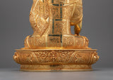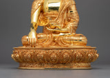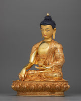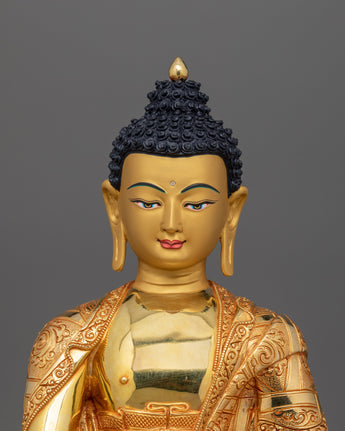 The Shakyamuni Buddha for Buddhist Altar is a sculpture of spiritual creativity and dedication. Handcrafted in Patan, Nepal, a center of fine Buddhist workmanship, this statue is meticulously crafted from a copper body, gilded in 24K gold, and embellished with beautiful gold and acrylic paints. Standing 13.2"/33.5cm tall, 9.4"/24cm at the base, and weighing 4.54 kg, this magnificent sculpture exudes tranquillity and is an excellent addition to any sacred altar or meditation space.