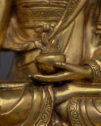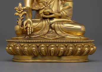 Bhaisajyaguru Healing Buddha Statue is 5.9"/15cm tall and is composed of copper and gilded with 24K gold. It also features detailed gold and acrylic paintings that add to its divine presence. Despite its small size, weighing only 0.67 kg, this statue exudes a strong spiritual presence, making it excellent for altars, meditation places, or as a thoughtful gift.