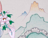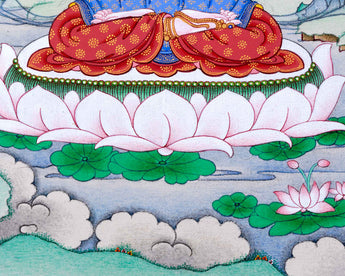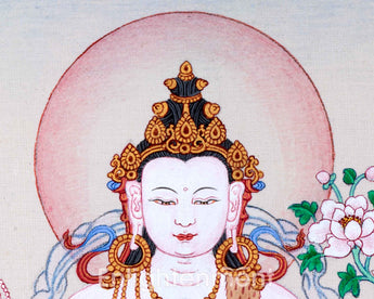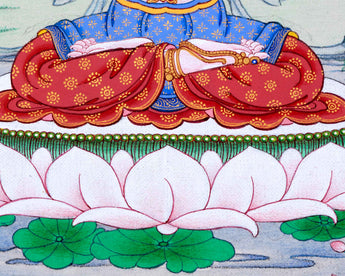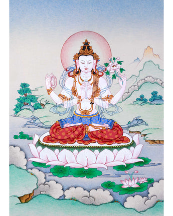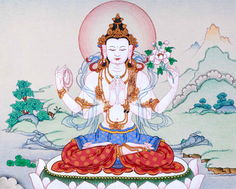 Our skilled artist has crafted a mesmerizing thangka of Chenrezig, the bodhisattva of compassion. The painting is on a cotton canvas with acrylic color and genuine 24K gold. This divine artwork showcases a magnificent backdrop of majestic mountains and serene lakes, enhancing the ethereal ambiance. Chenrezig is depicted with a radiant halo illuminating the expanse behind his head. Adorned with a jeweled crown, the bodhisattva sits gracefully upon a lotus seat. His body is positioned in Vajra posture, with a wish-fulfilling crystal gracefully held between his two arms, his other two hands delicately clasp a fully bloomed lotus and a crystal rosary, also known as Tibetan beads. An intriguing detail reveals a part of a deer skin adorning Chenrezig's left shoulder. This captivating thangka invites you to connect with the embodiment of compassion, Chenrezig, and embark on a journey of profound spiritual awakening.