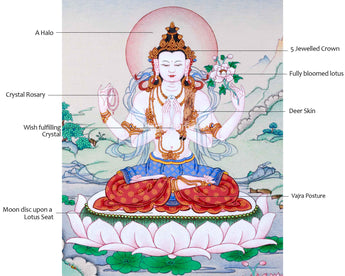Chenrezig is the most revered Bodhisattva, embodying the compassion of all Buddhas. He is also known as Avalokitesvara, which means "One Who Looks With An Unwavering Eye." He listens to the cries of all sentient beings during times of strife and trouble. In a devotional gesture, his two front hands clasp in front of his jewel-draped heart. On his upper right hand, he wears a crystal akshamala, or rosary, representing the never-ending cycle. His left hand is carrying a white lotus, indicating that he liberates conscious beings from the muddy streams of agony and hellish places, guiding them to higher levels of enlightenment. He wears silk and sits on a row of lotus petals, his legs in the "diamond position" of meditation.