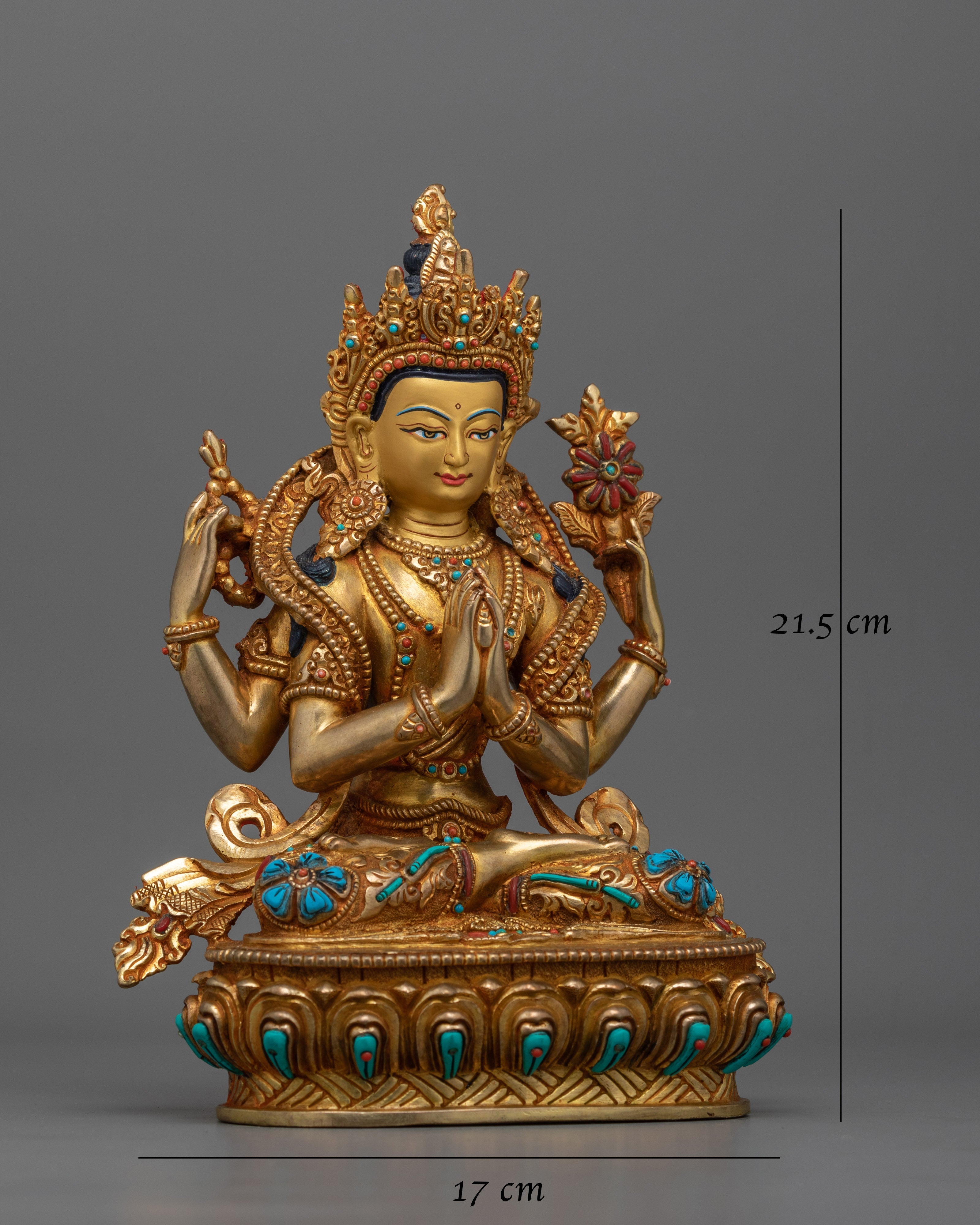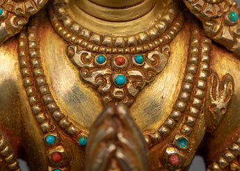 The sacred Chenrezig Buddha statue is carefully plated in 24K gold, with elaborate gold and acrylic paintings emphasizing Chenrezig's tranquil look and beautiful nuances. The statue's copper body is embellished with hand-carved gemstones, bringing a fantastic touch of religious creativity to the spiritual figure. The statue's tiny base, which is 6.7 inches broad, makes it ideal for personal altars, meditation places, or as a meaningful present for a loved one.