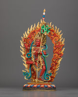 Dorje Phagmo is depicted in her dynamic form, standing with one leg bent and the other outstretched in a powerful stance, crushing obstacles underfoot. Her right hand holds a vajra, symbolizing indestructible wisdom, while her left hand holds a kapala (skull cup), representing the transcendence of worldly attachments. Her flaming aura symbolizes the burning away of ignorance and the illumination of ultimate truth. The intricate gemstones that adorn her crown and ornaments further add to the statue’s majestic presence, creating an aura of fierce energy and transformative power.