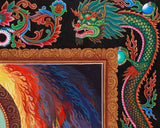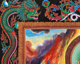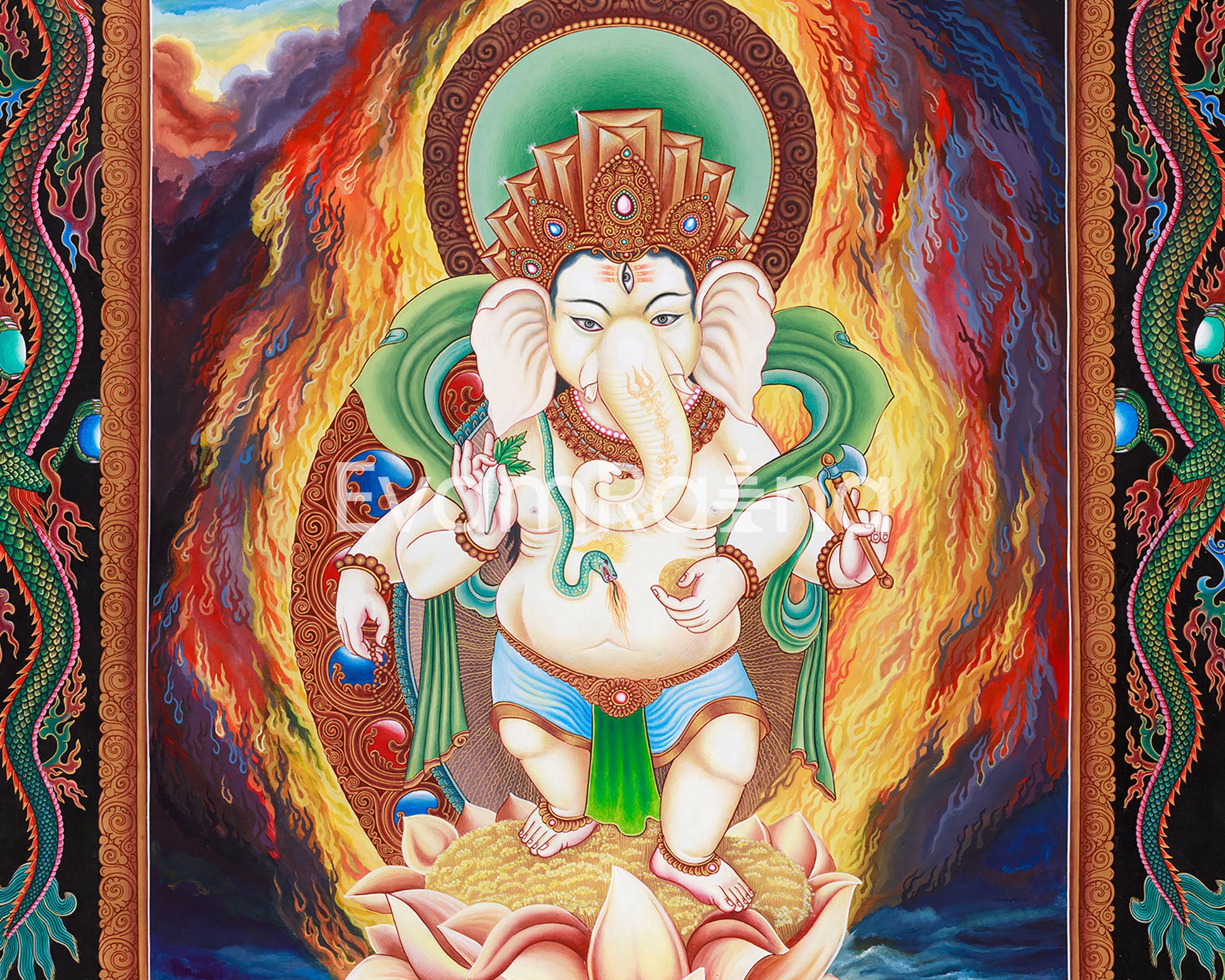 Ganesh, portrayed with a radiant complexion and serene demeanor, stands majestically on a blooming lotus emerging from a swirling cosmic ocean, symbolizing purity and divine birth amidst worldly imperfections. He carries symbolic objects, including a dish of sweets representing life's rewards. A serpent decorates his round belly, symbolizing vitality and mastery over the life force. Flames burst in the background, creating a fiery halo that represents Ganesh's power to eliminate negative energies and illuminate the path to transformation. The presence of his beloved mouse in the lower left corner symbolizes humility and the ability to overcome ego. Ideal for meditation rooms, home altars, or spiritual collections, it encourages the viewer to invoke Ganesh's blessings for clarity, courage, and new beginnings.