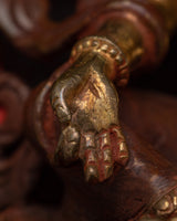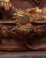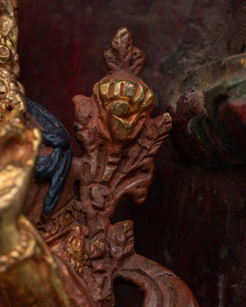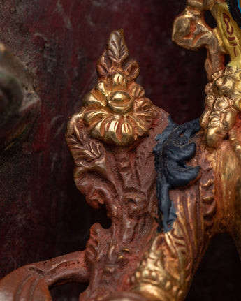 The sacred Green Tara Statue with Throne is 11 inches tall and depicts Green Tara seated elegantly on a throne, signifying her function as a guardian and rescuer of all beings. This statue is handcrafted from a copper body and delicately adorned with 24K gold gilded, gold, and acrylic paintings, giving it a celestial air. The beautifully constructed throne gives a sense of grandeur, making this a mesmerizing center point in any shrine, altar, or meditation room. The base, which measures 6.9 inches, is robust and safe, guaranteeing that the statue stands firm and stable.