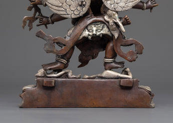 The sacred Hayagriva with Consort statue, weighing 2.96 kg, makes it ideal for individuals looking to bring Hayagriva's protection into their home or meditation place. The oxidized copper finish gives the sculpture a timeless, ancient appearance, while the silver plating adds a touch of refinement and highlights the figurines' detailed features.