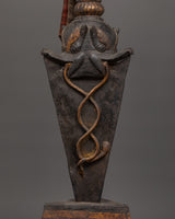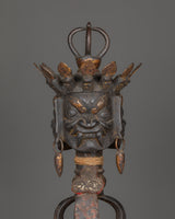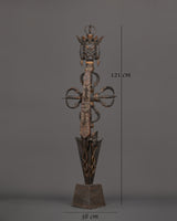 This incredible Sacred Iron Phurba Dagger is a powerful representation of spiritual transformation and divine frustration, astounding 121 cm tall and 38 cm wide. Made entirely of iron and weighing 15.37 kg, this enormous ritual object is flanked by vajra handles, which represent strength and indestructibility in Vajrayana Buddhism. It is crowned with a furious three-faced god.