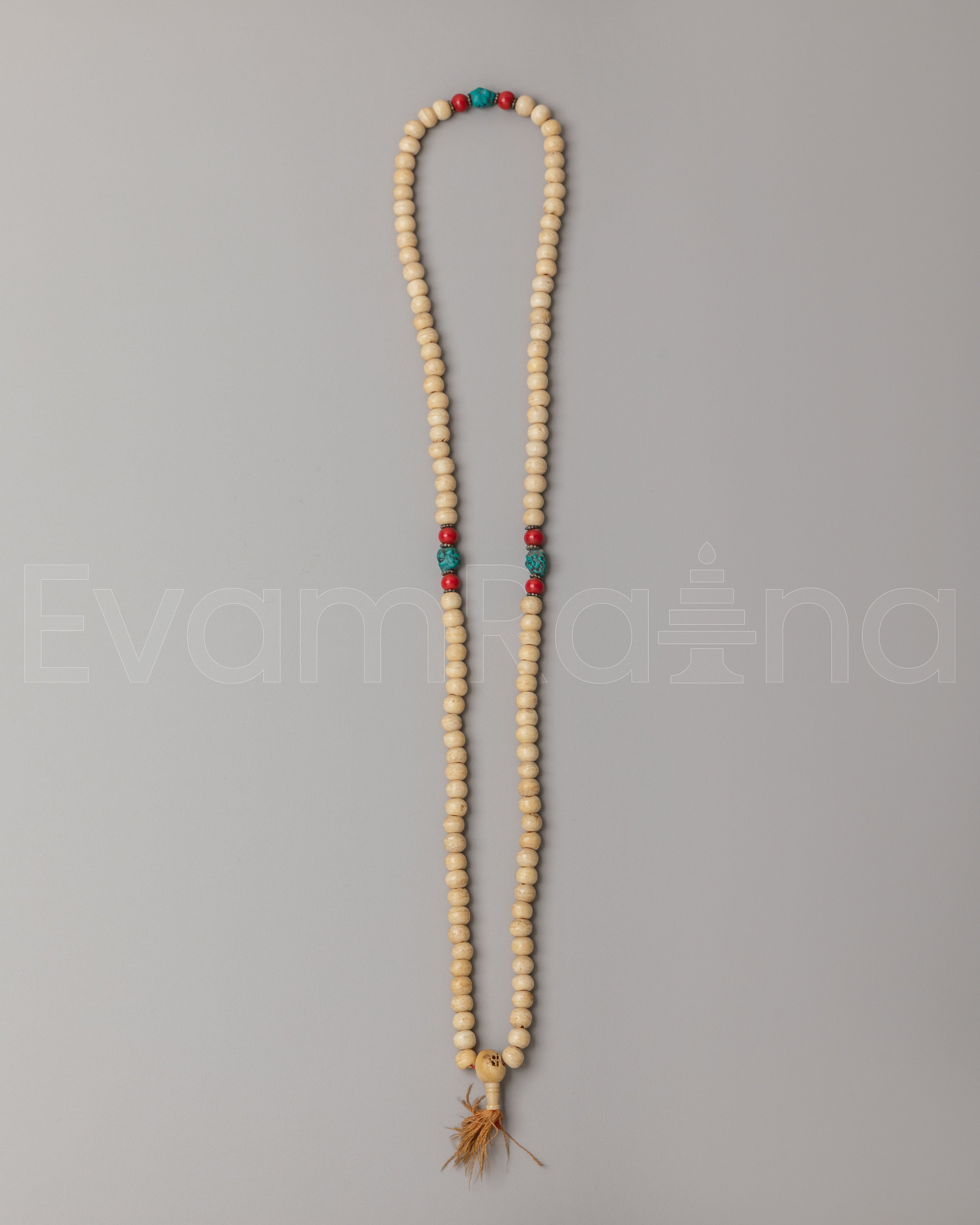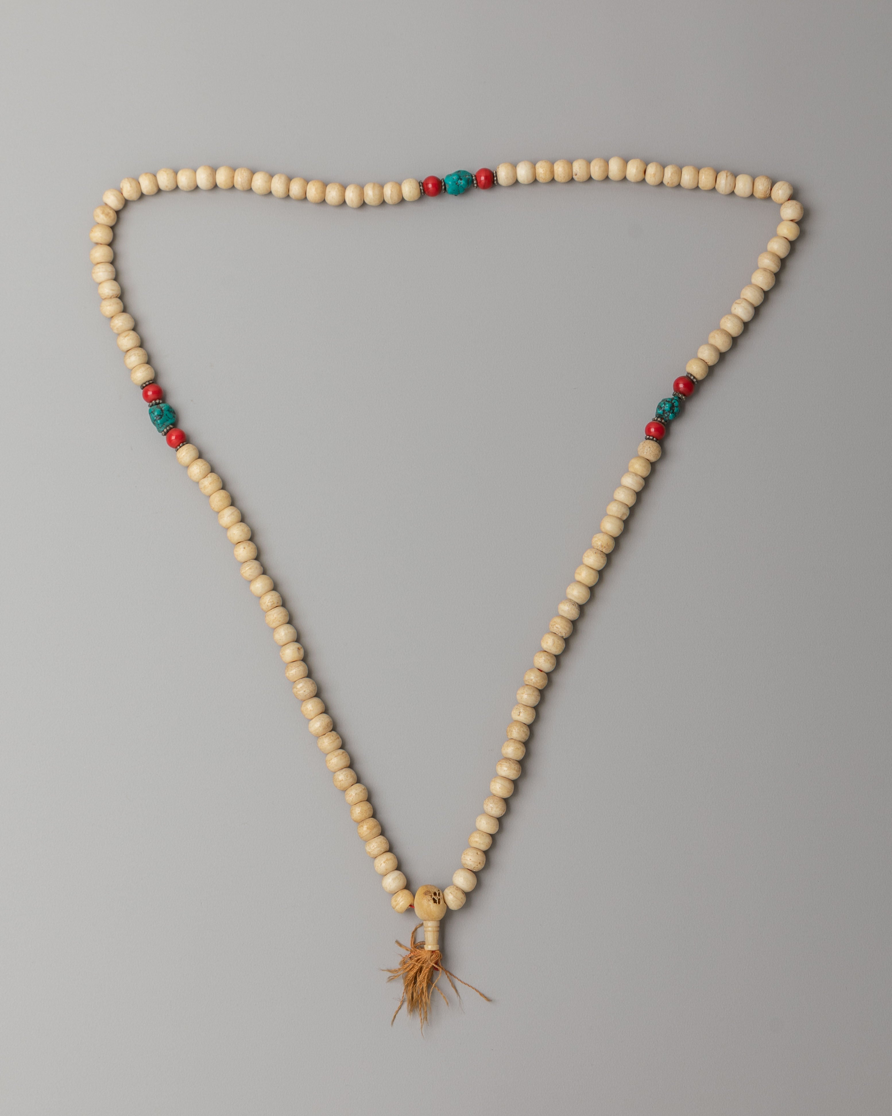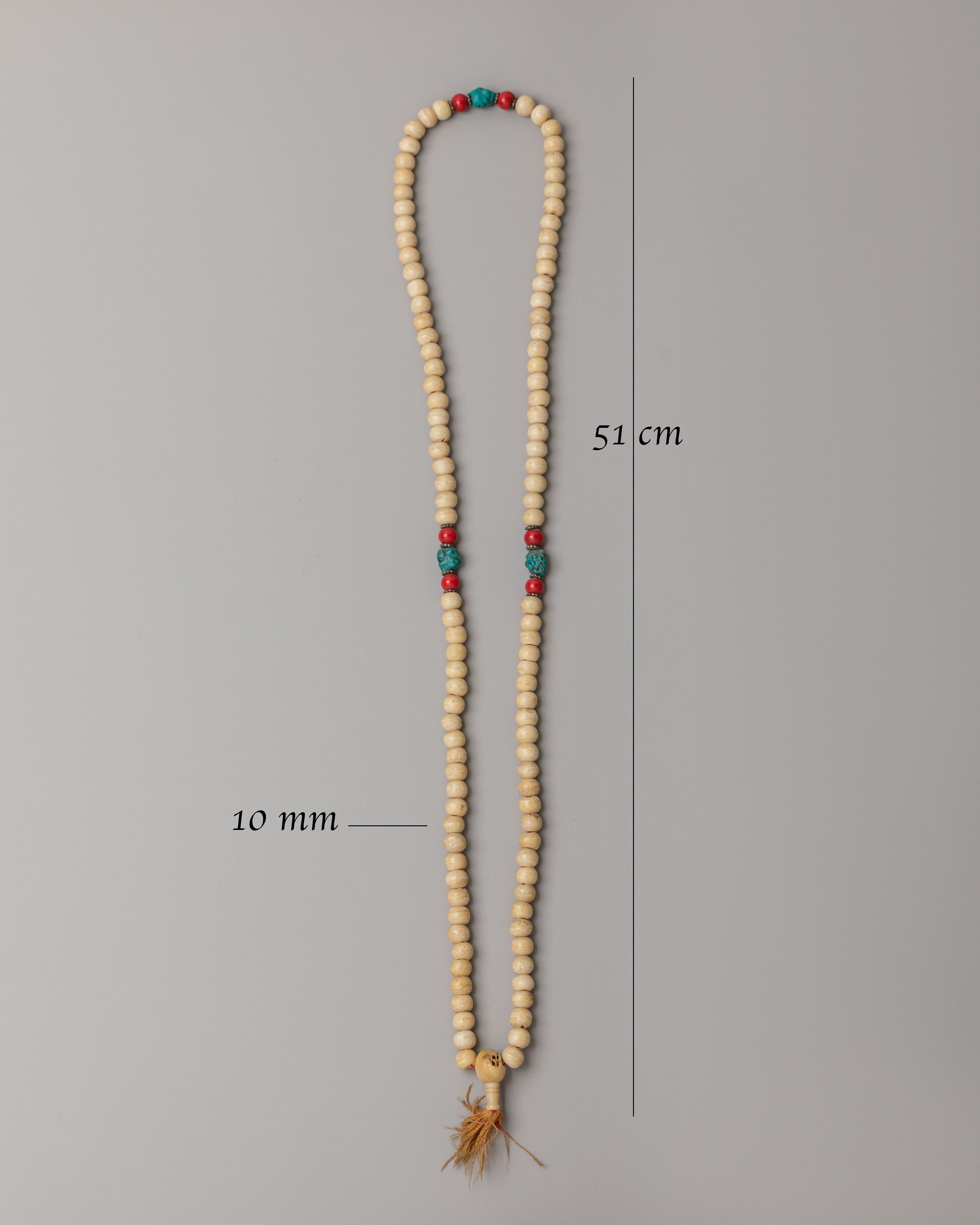 The mala features evenly spaced beads complemented by decorative accent beads that add subtle color and symbolic beauty. The natural texture and soft tones of yak bone give the mala an earthy, spiritual presence, while the accent stones provide visual harmony and traditional Himalayan character. The strand is finished with a tassel that represents unity, devotion, and the completion of mantra cycles. The simple yet elegant design reflects authentic Buddhist tradition and makes the mala suitable for both spiritual practice and wearable sacred jewelry.