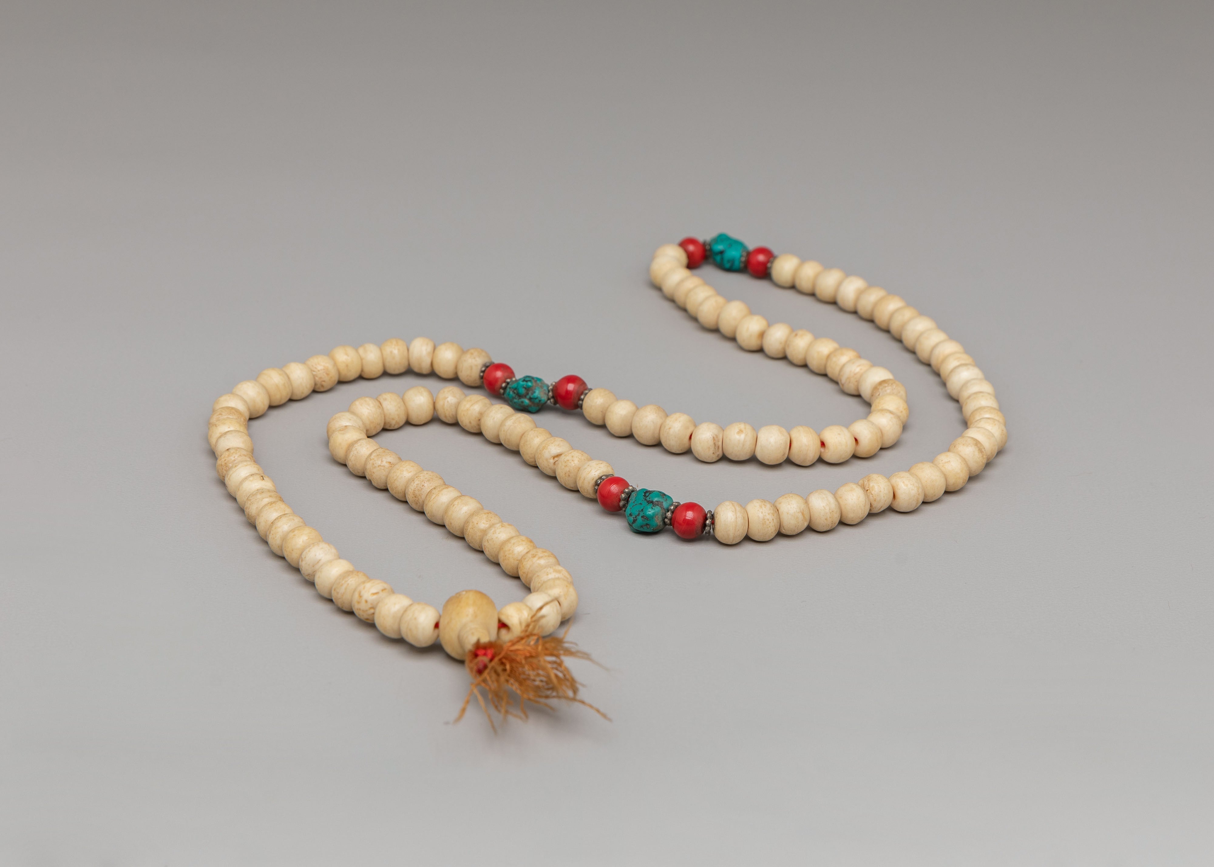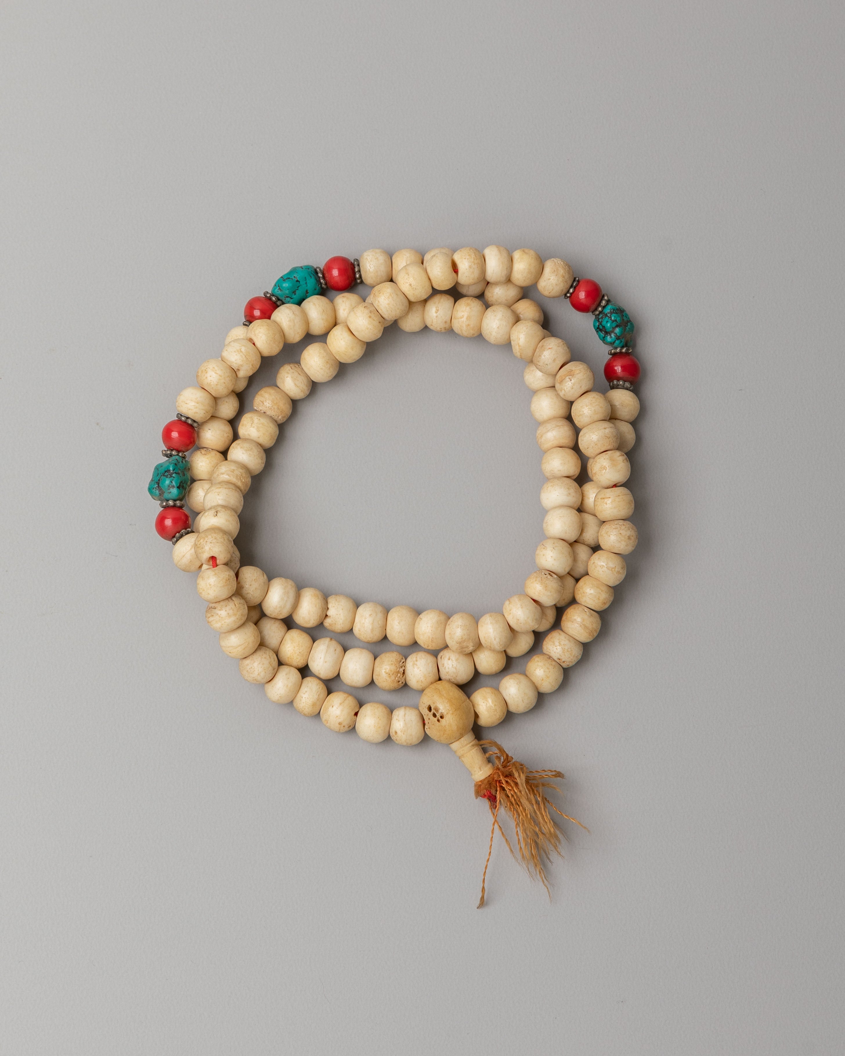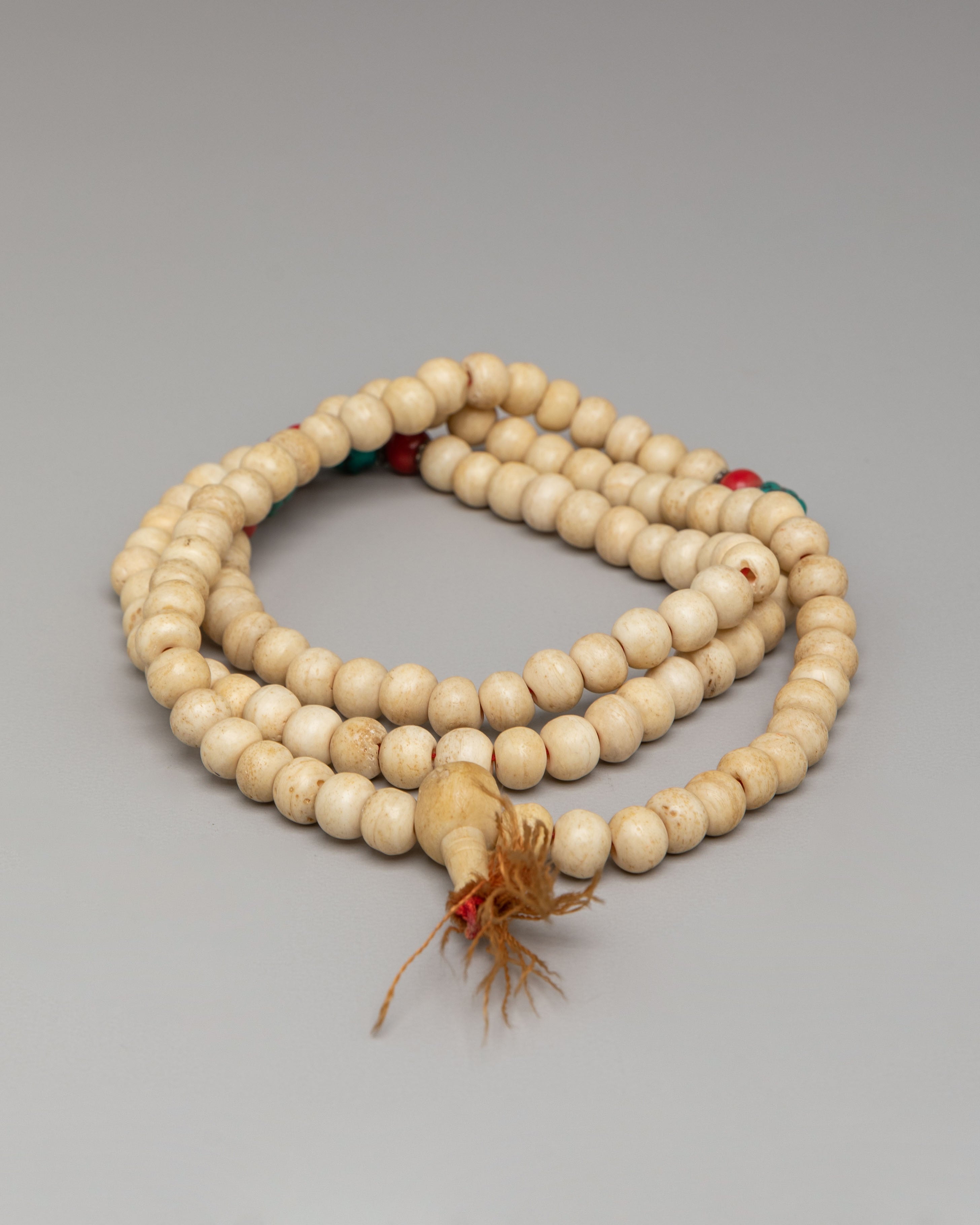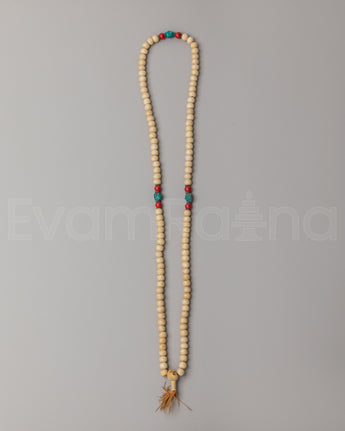 The mala features evenly spaced beads complemented by decorative accent beads that add subtle color and symbolic beauty. The natural texture and soft tones of yak bone give the mala an earthy, spiritual presence, while the accent stones provide visual harmony and traditional Himalayan character. The strand is finished with a tassel that represents unity, devotion, and the completion of mantra cycles. The simple yet elegant design reflects authentic Buddhist tradition and makes the mala suitable for both spiritual practice and wearable sacred jewelry.
