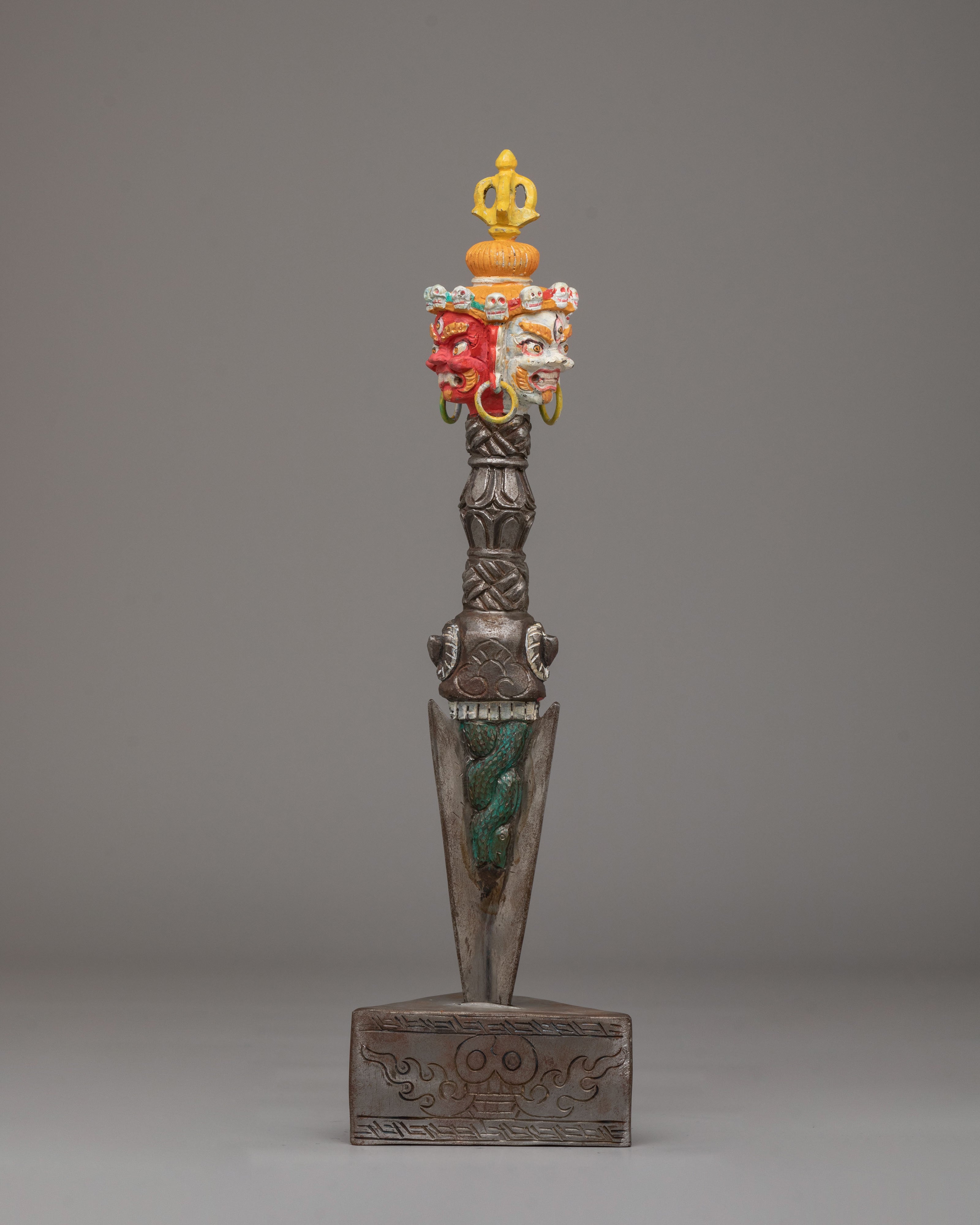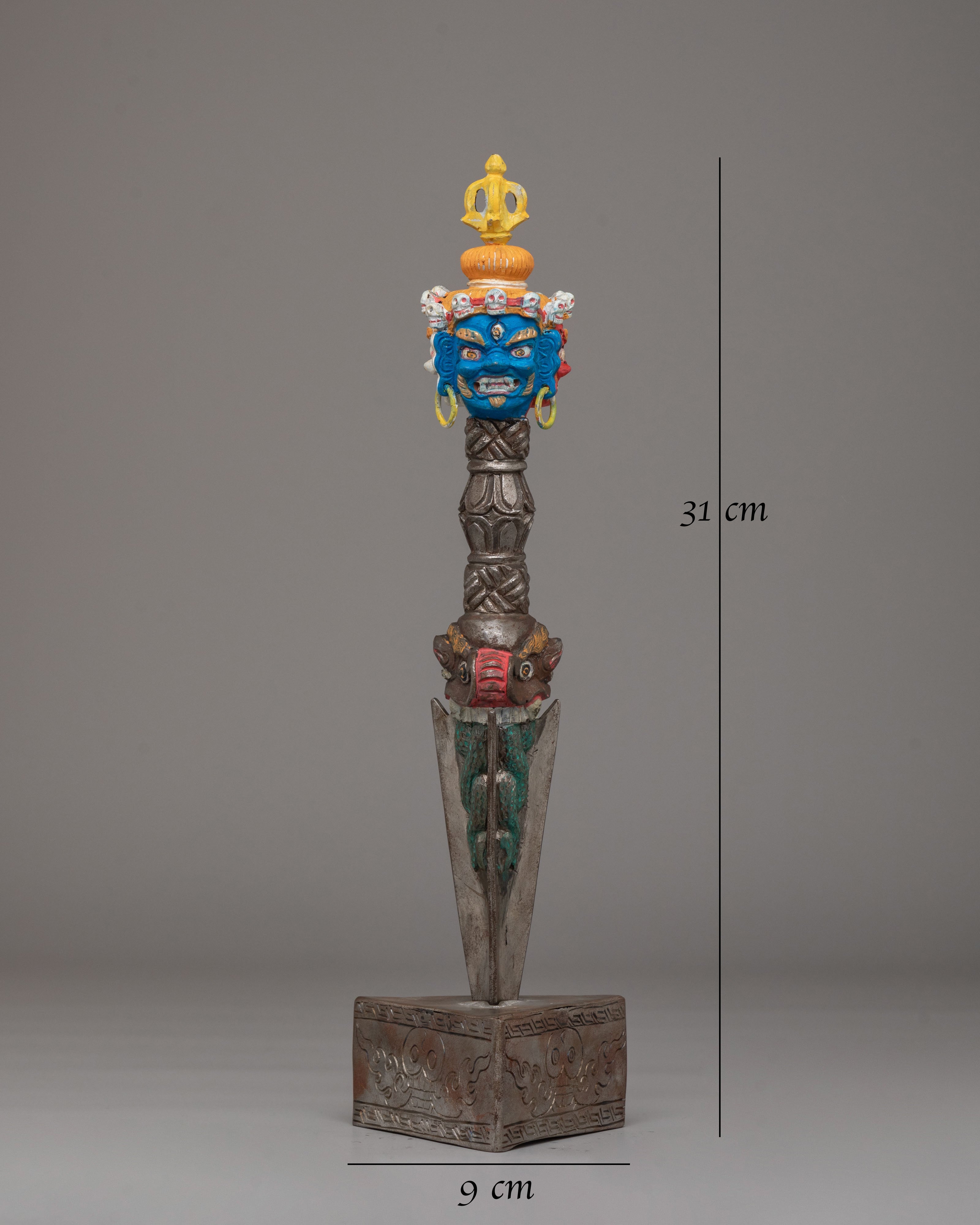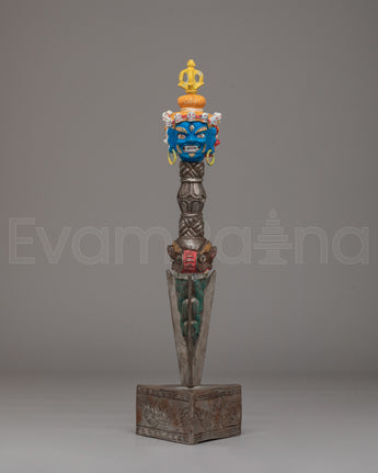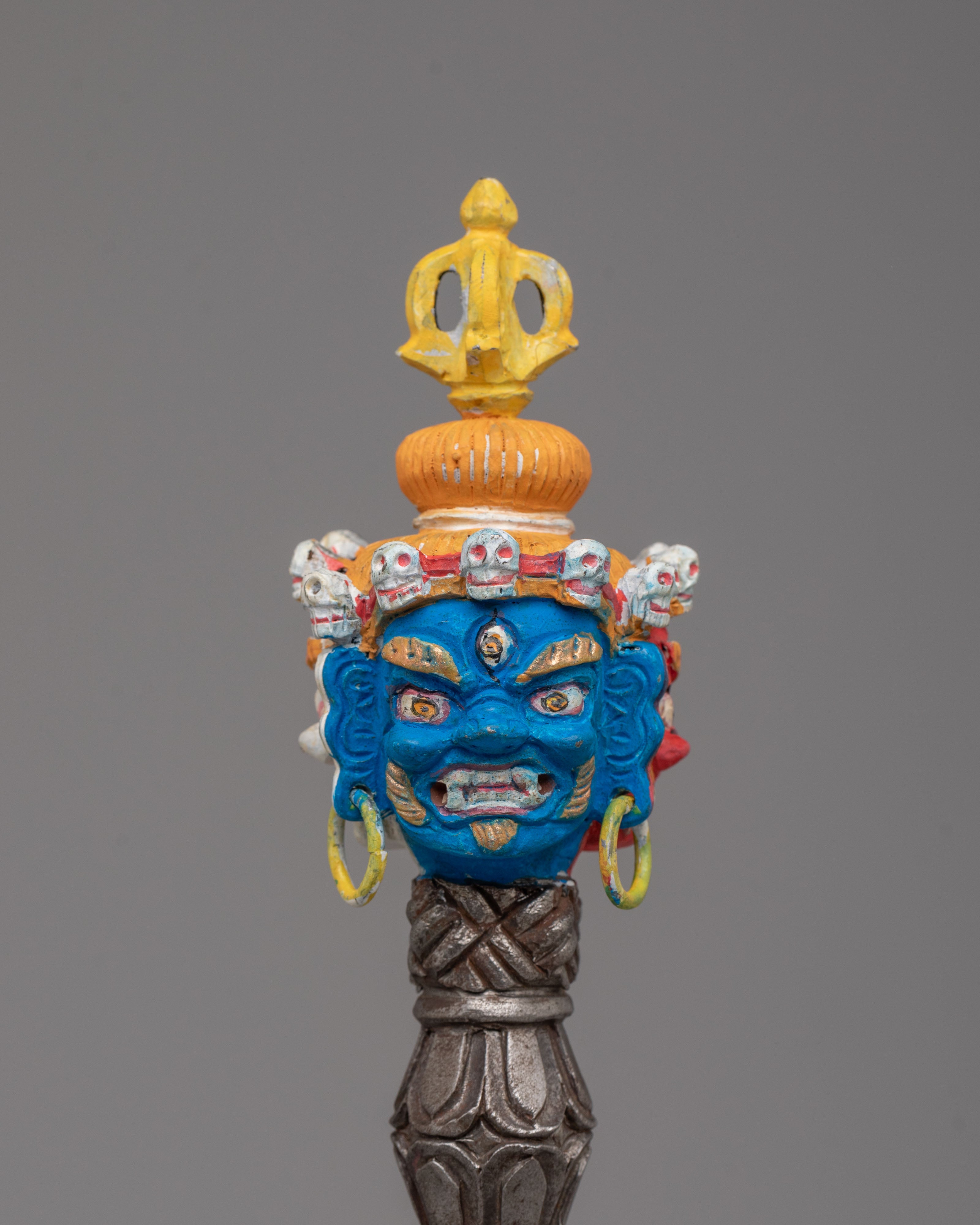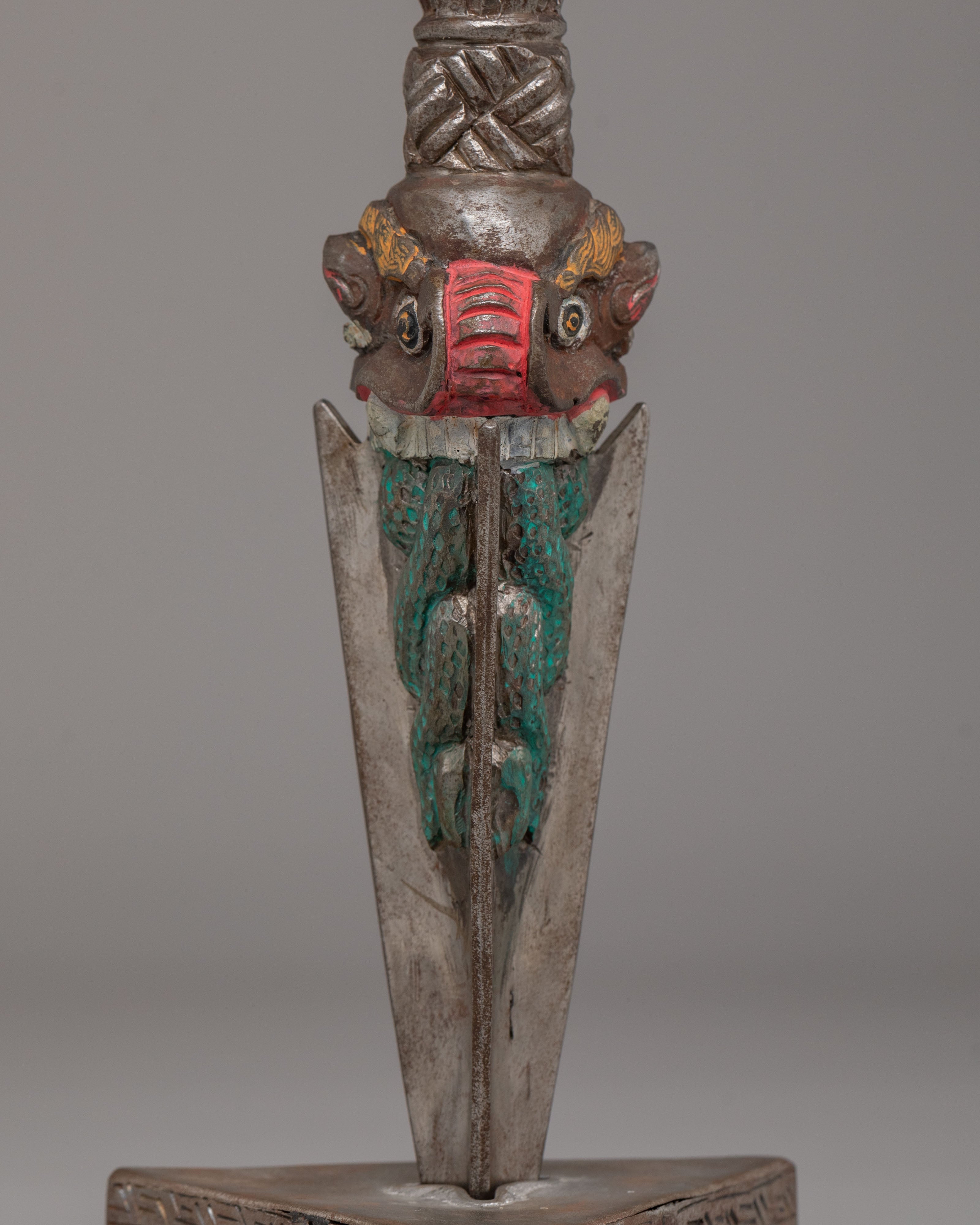 The upper section features a powerful three headed wrathful deity with face painted details.The handle is adorned with carved motifs, including stacked vajra-inspired forms and protective faces, representing the subjugation of negative forces. The triangular blade emerges below, symbolizing the cutting of ignorance, attachment, and obstacles. The sculpted base enhances its ritual presence and reflects classic Himalayan craftsmanship found in sacred Buddhist ritual objects.