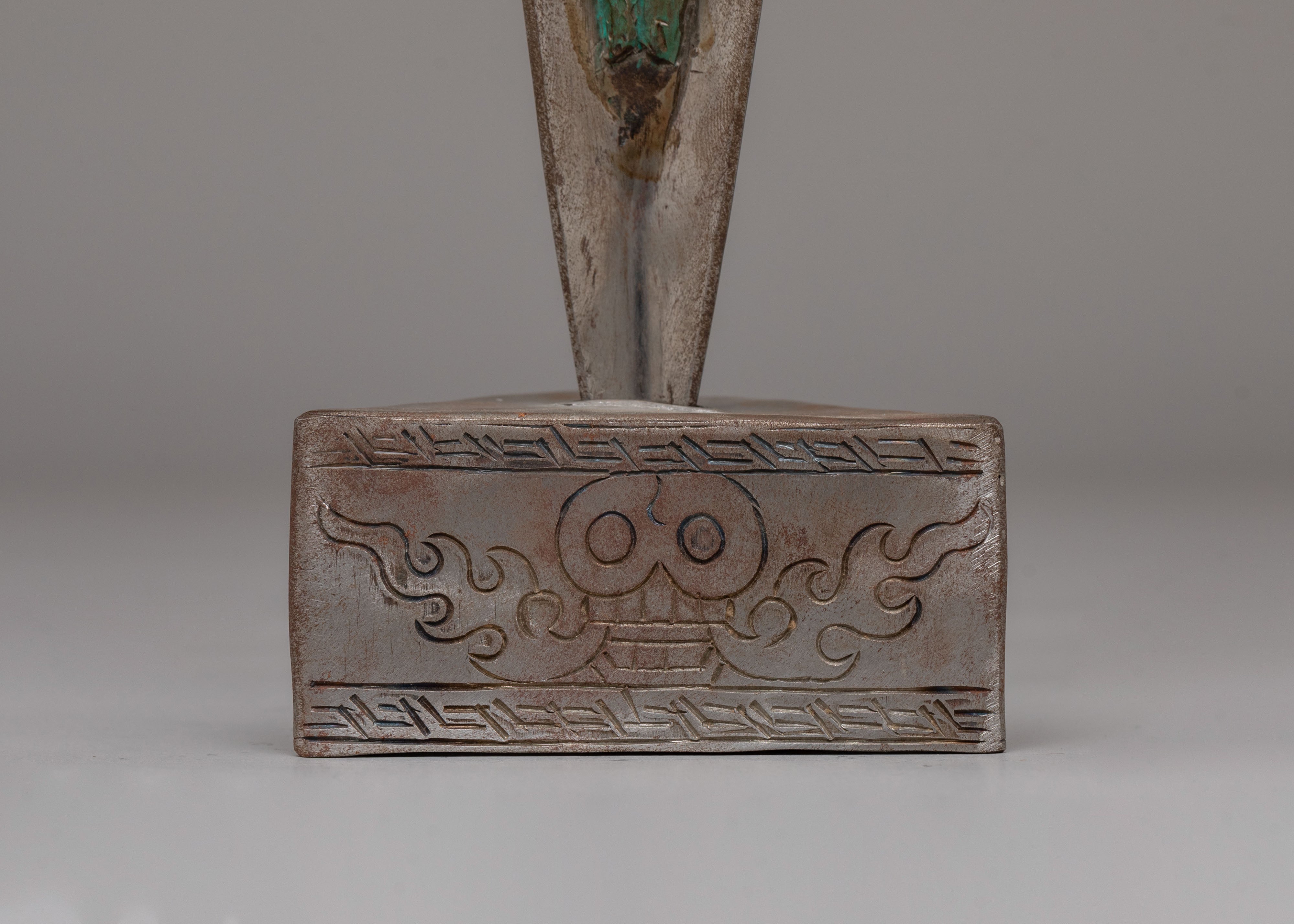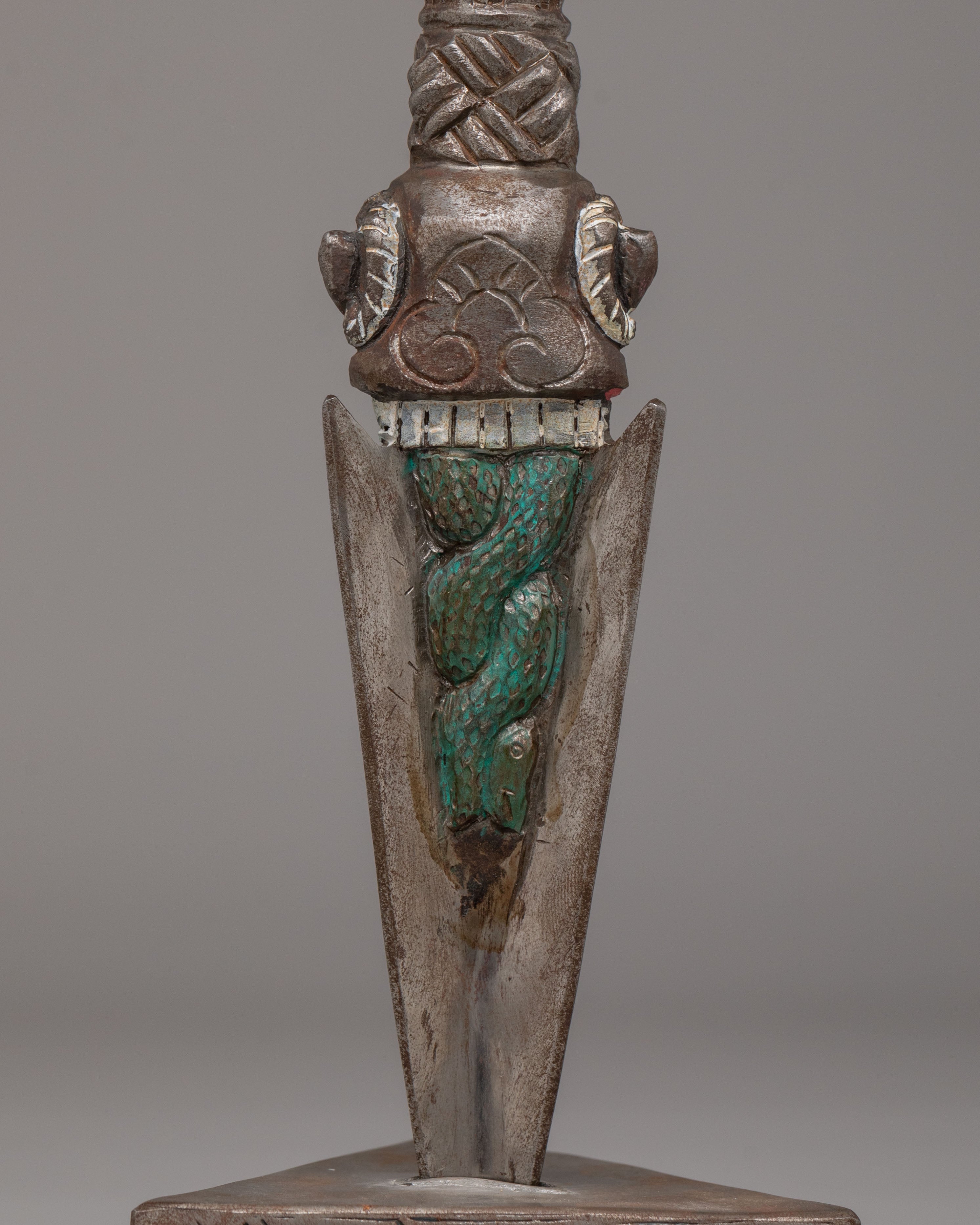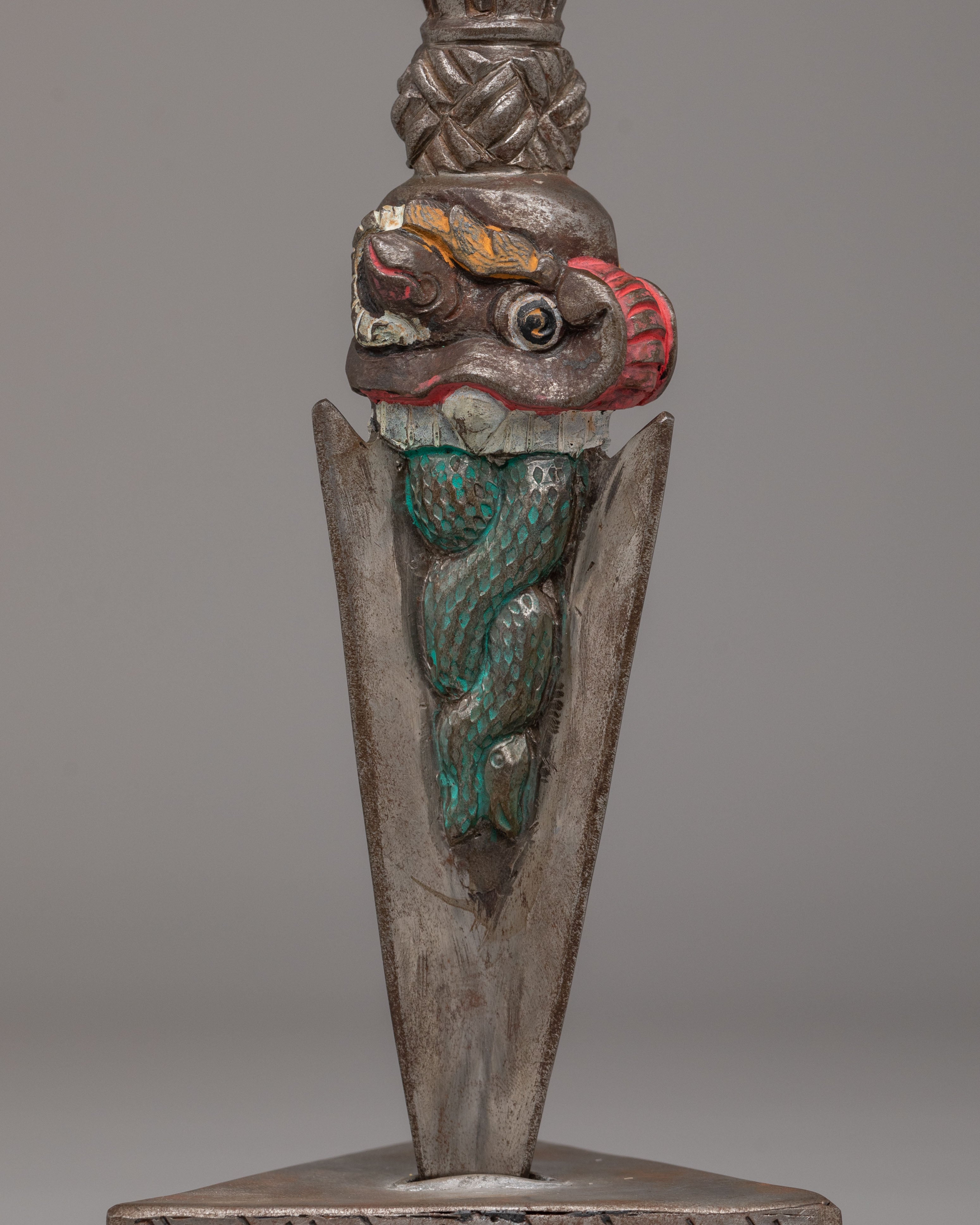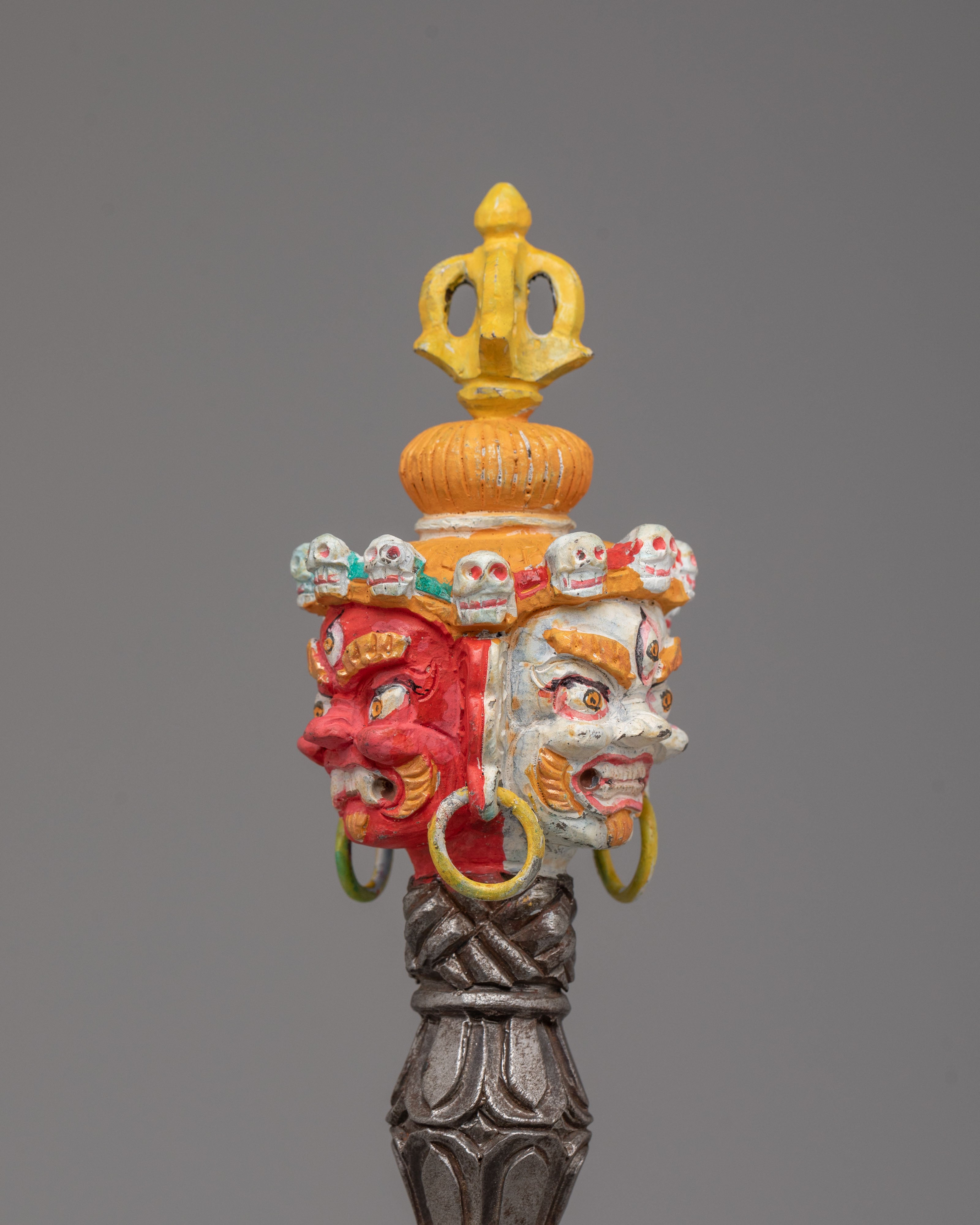 The upper section features a powerful three headed wrathful deity with face painted details.The handle is adorned with carved motifs, including stacked vajra-inspired forms and protective faces, representing the subjugation of negative forces. The triangular blade emerges below, symbolizing the cutting of ignorance, attachment, and obstacles. The sculpted base enhances its ritual presence and reflects classic Himalayan craftsmanship found in sacred Buddhist ritual objects.