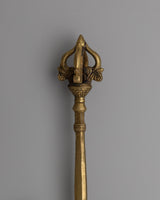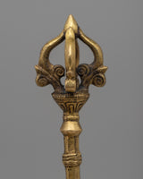 The Ceremonial Ritual Dagger Axe, with a brass body, is a stunning implement used in Tibetan Buddhist rites. At the summit of this sacred object is a half Vajra, which represents the unbreakable force of wisdom. The unusual design below it combines a half Vajra and half axe blade to make a straight-edged weapon that depicts cutting through delusion and ignorance. The base features another half Vajra, demonstrating the axe's powerful significance of strength, protection, and spiritual understanding.