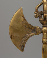 At 30 centimeters high by 15.5 centimeters wide and weighing 0.59 kg, this ceremonial dagger axe is durable and finely built. The attention to detail in the polished brass body highlights the craftsmanship that went into its manufacture. This axe, which is used in Tantric ceremonies, is a powerful spiritual tool for protection and change. It indicates the practitioner's capability to overcome hardships and purify negative forces. It is also a visually captivating object.