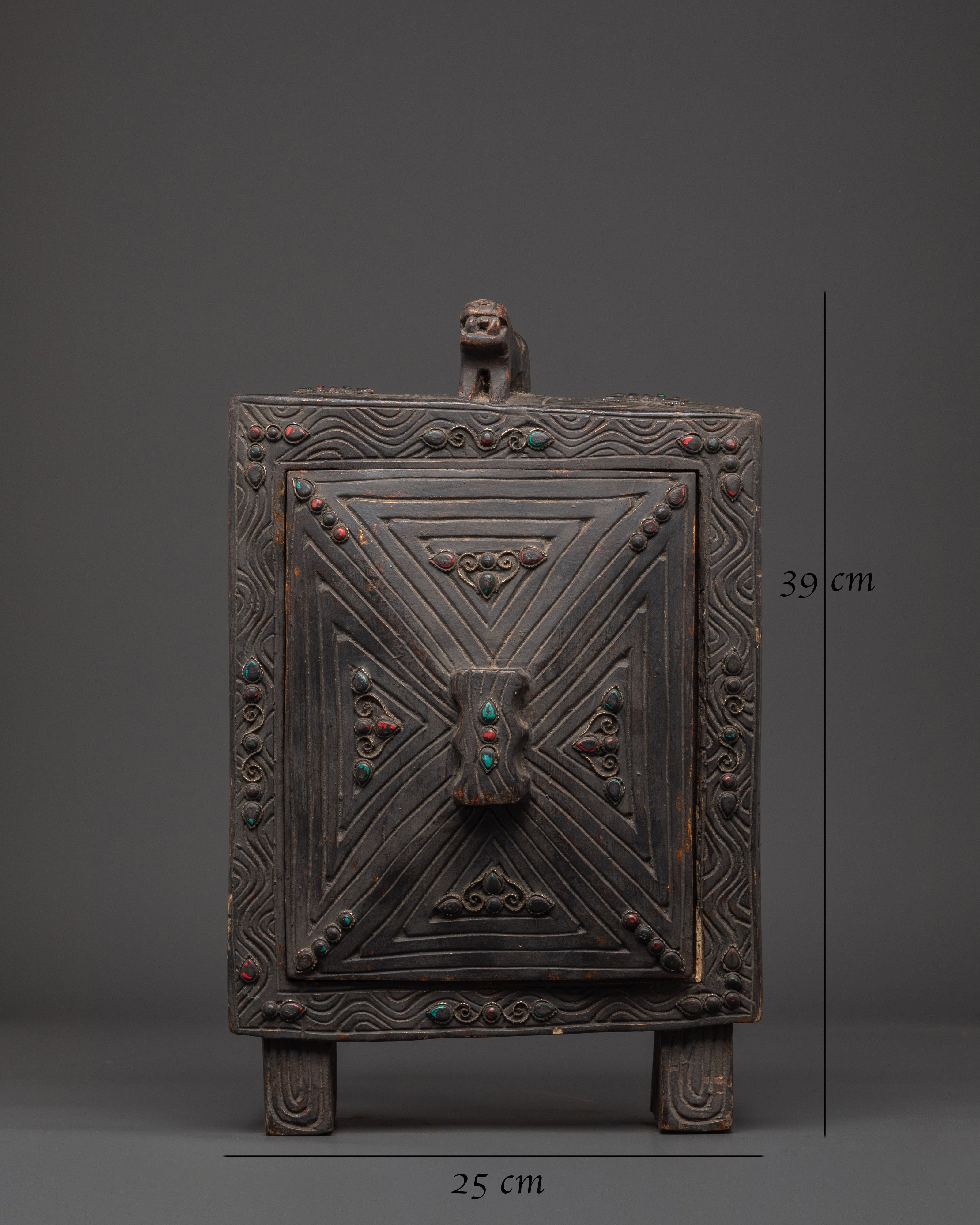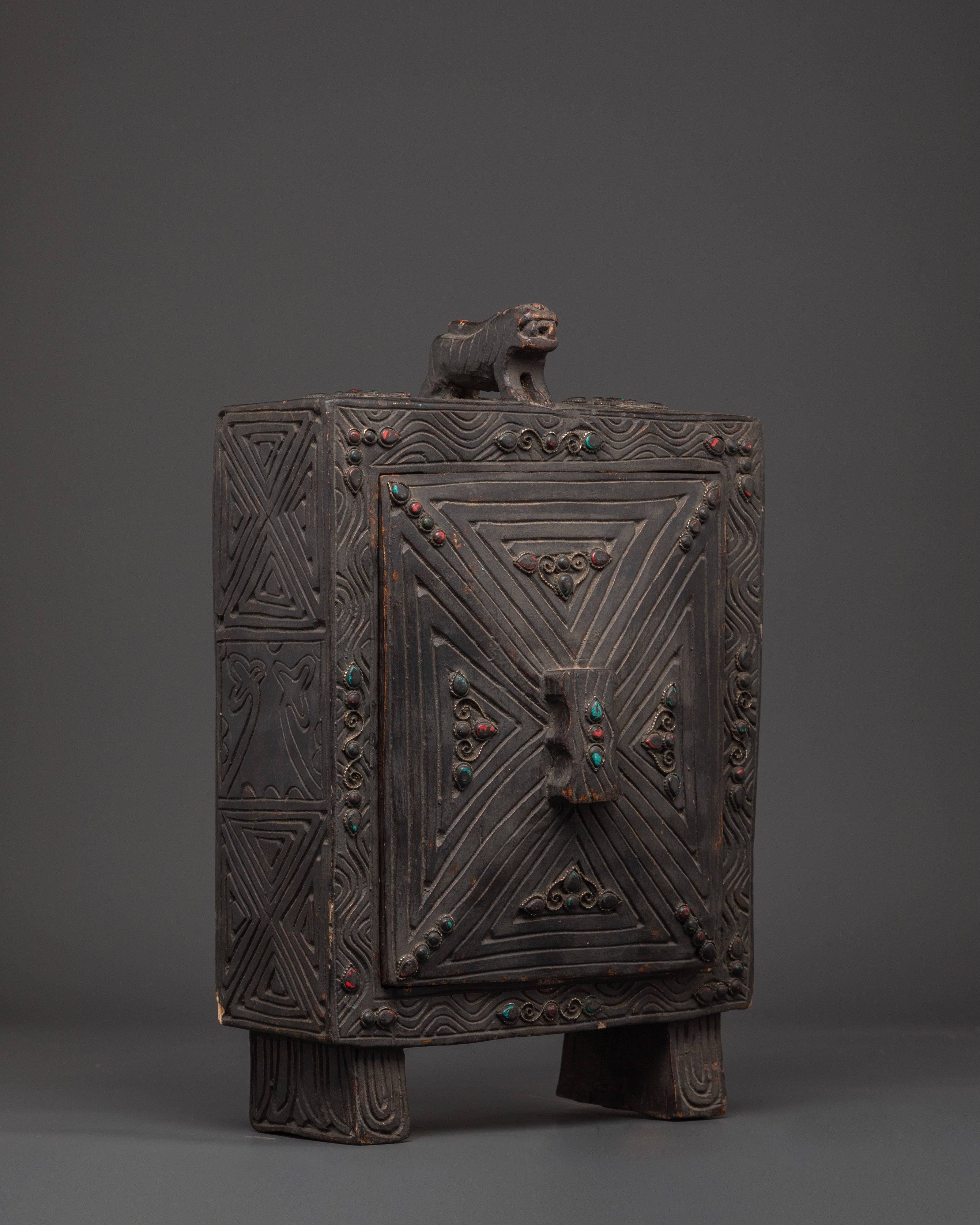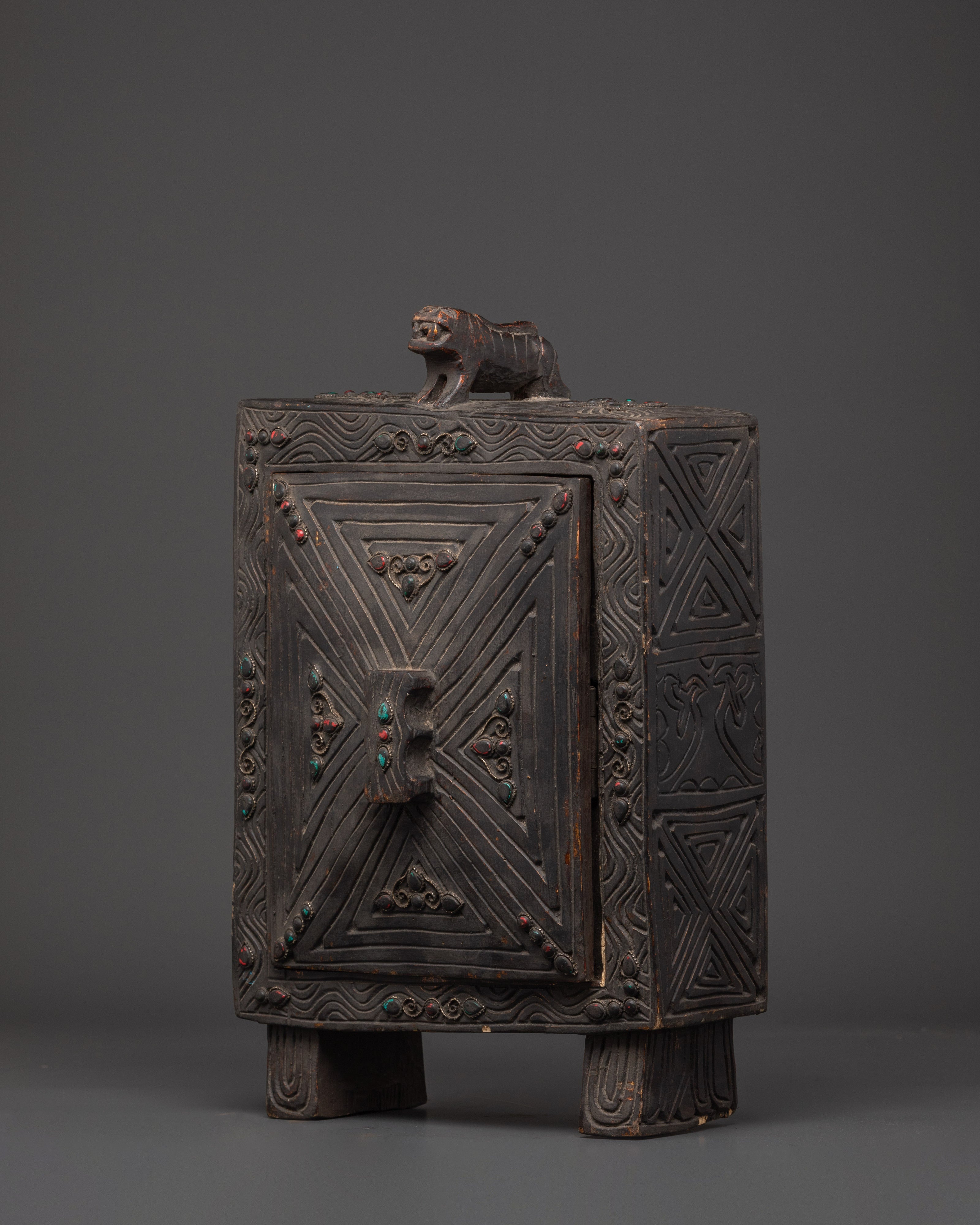 This Sacred Shakyamuni Buddha in a Wooden Box is a remarkable Tibetan Buddhist shrine, handcrafted entirely from wood and created to preserve and honor the spirit of devotion. Measuring 39 cm in height and 25 cm in width, and weighing 3 kg, it carries an aura of sacred presence. The exterior is enhanced with layered carvings, flowing border patterns, and jewel-like accents in deep red and green tones. A guardian lion rests atop the shrine, a symbol of watchfulness and protection in Himalayan tradition.