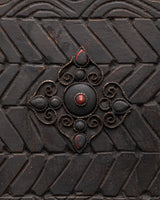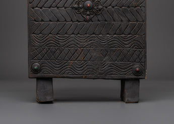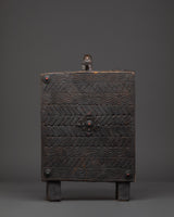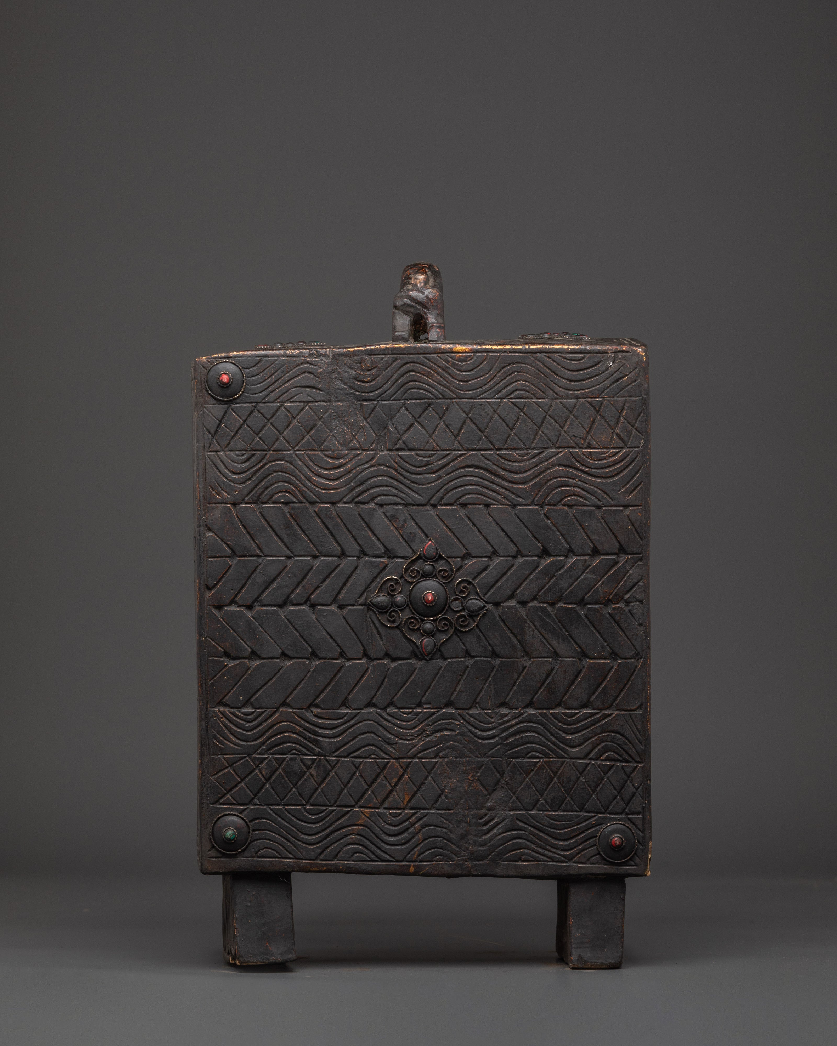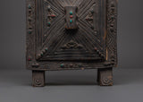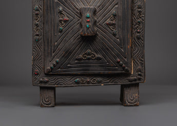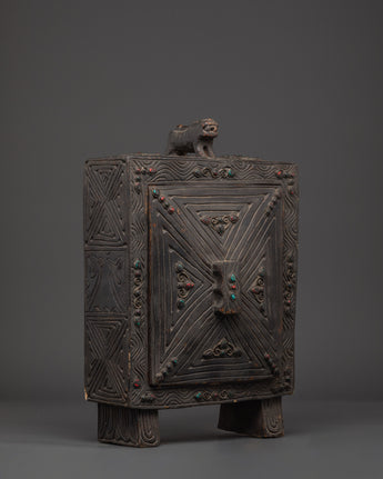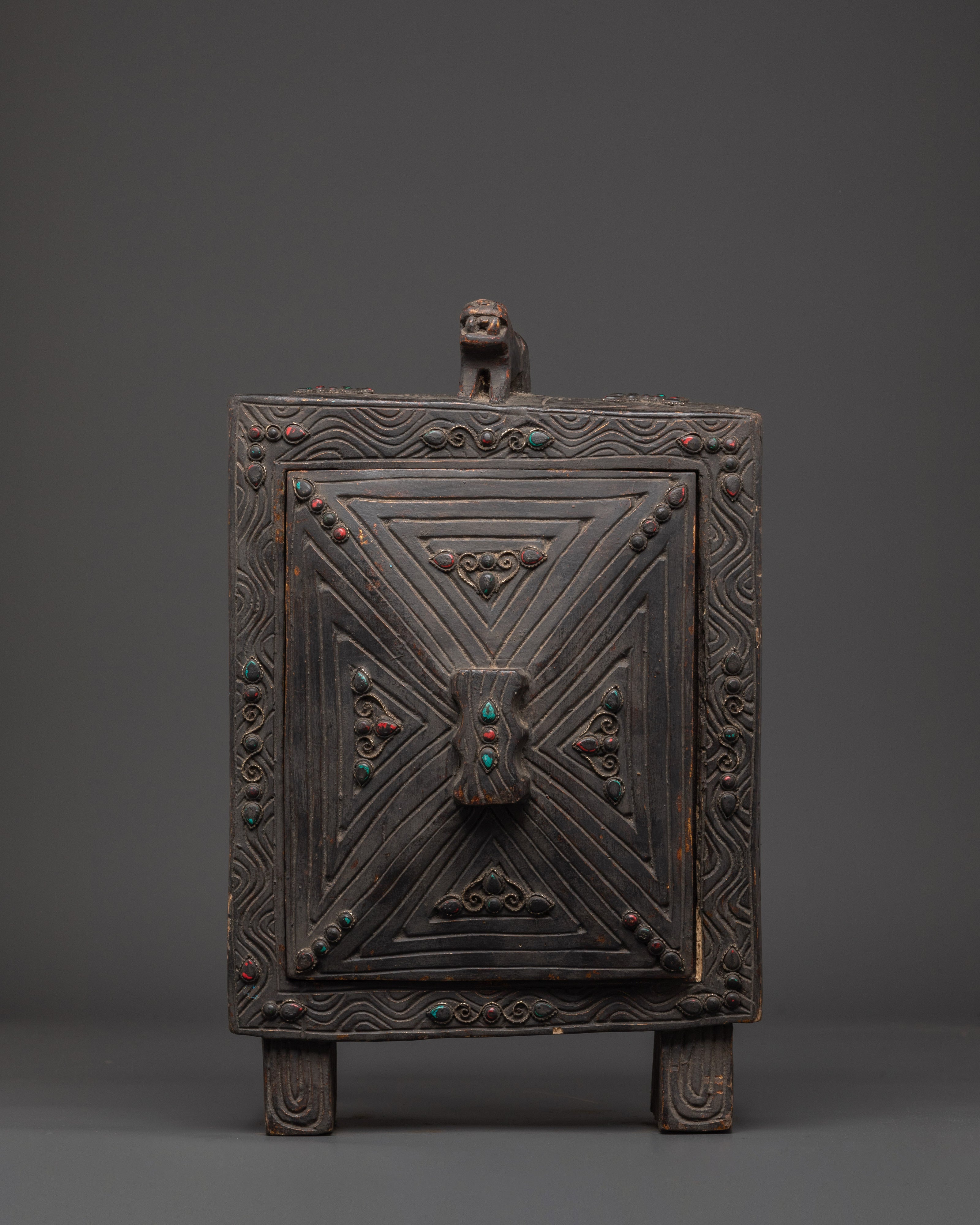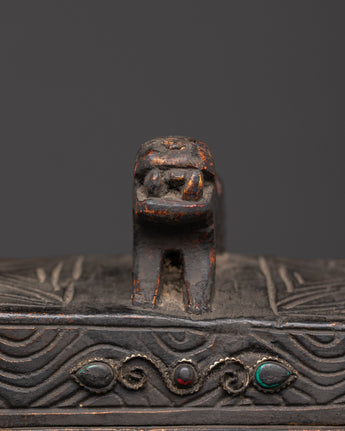 This Sacred Shakyamuni Buddha in a Wooden Box is a remarkable Tibetan Buddhist shrine, handcrafted entirely from wood and created to preserve and honor the spirit of devotion. Measuring 39 cm in height and 25 cm in width, and weighing 3 kg, it carries an aura of sacred presence. The exterior is enhanced with layered carvings, flowing border patterns, and jewel-like accents in deep red and green tones. A guardian lion rests atop the shrine, a symbol of watchfulness and protection in Himalayan tradition.