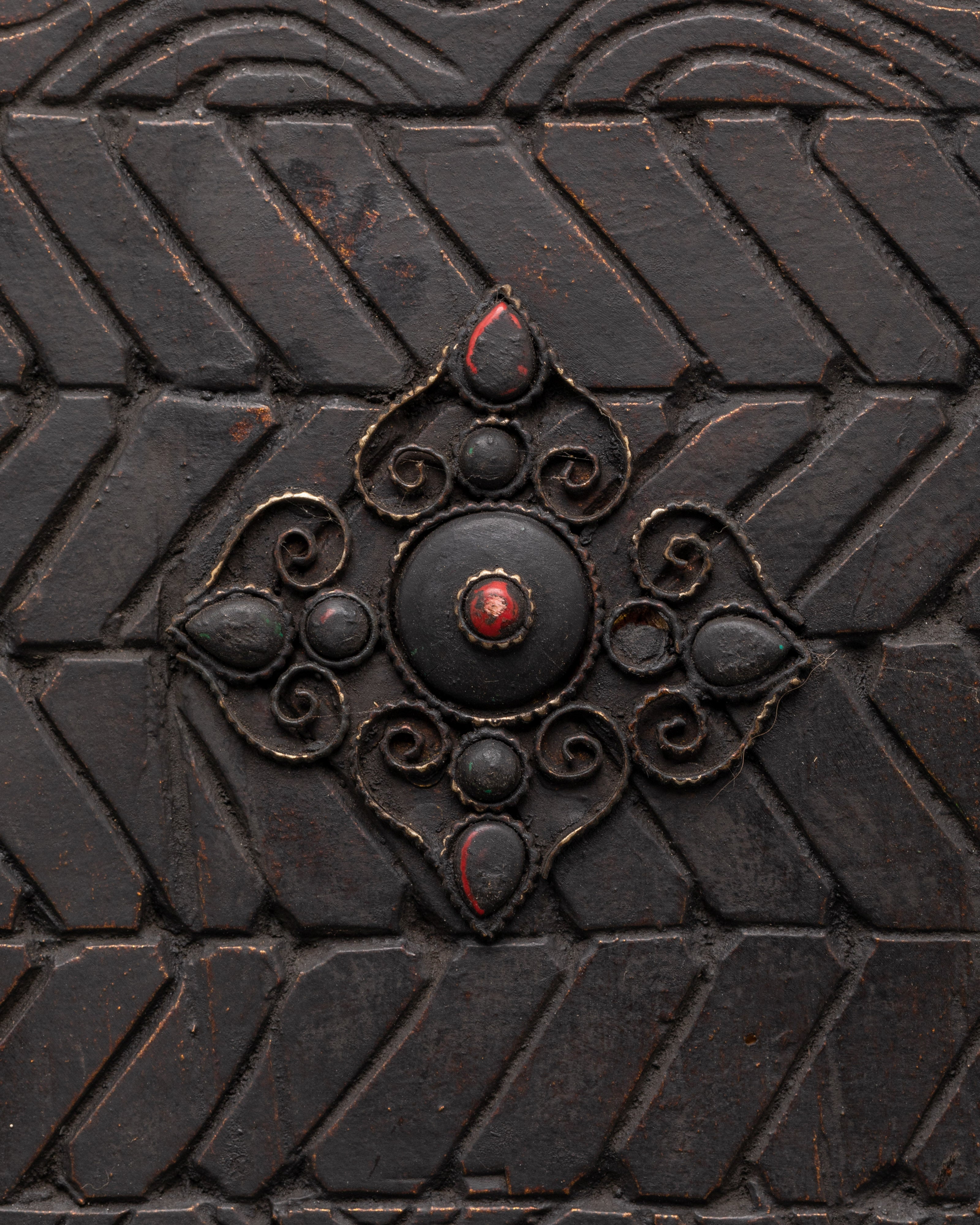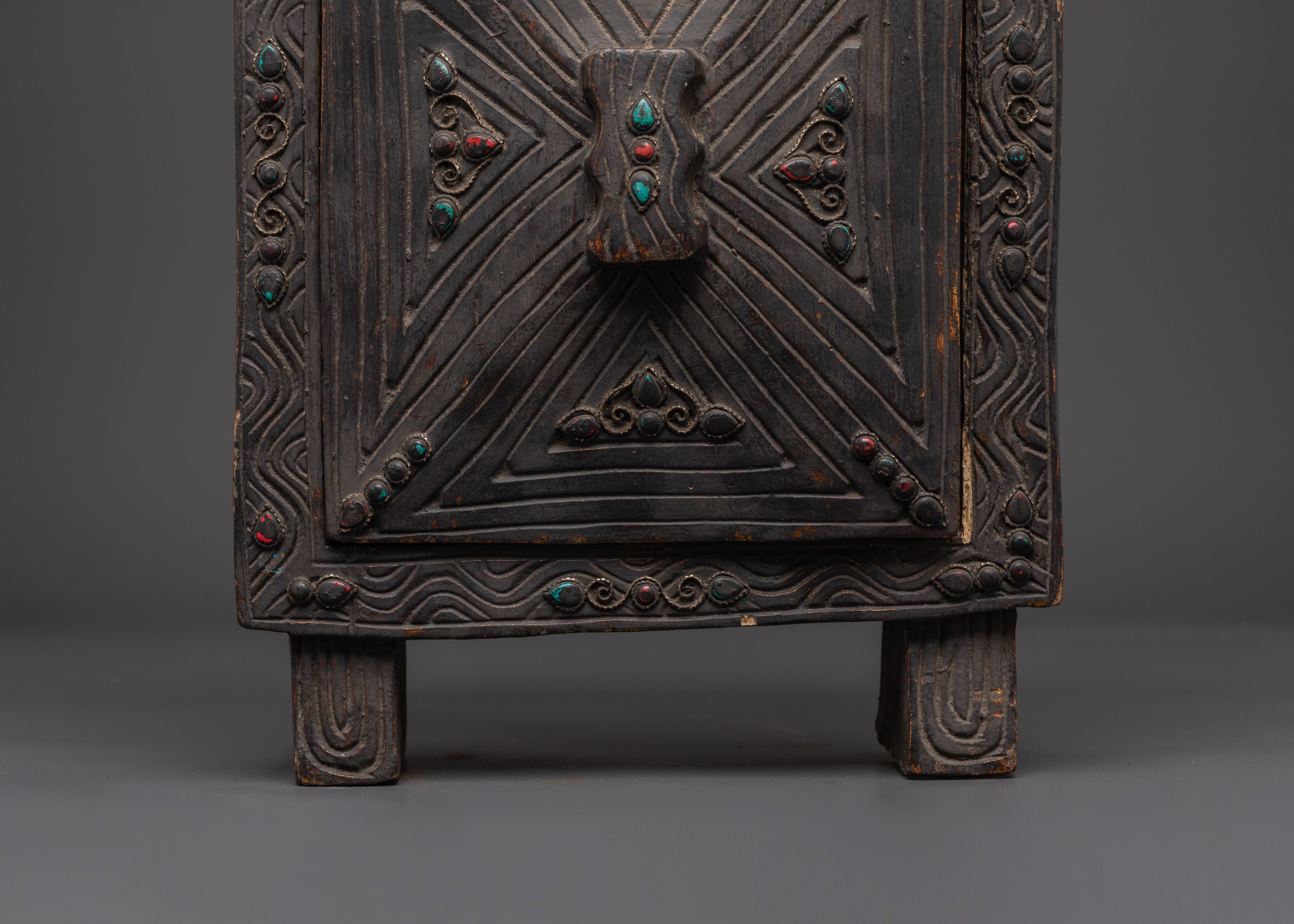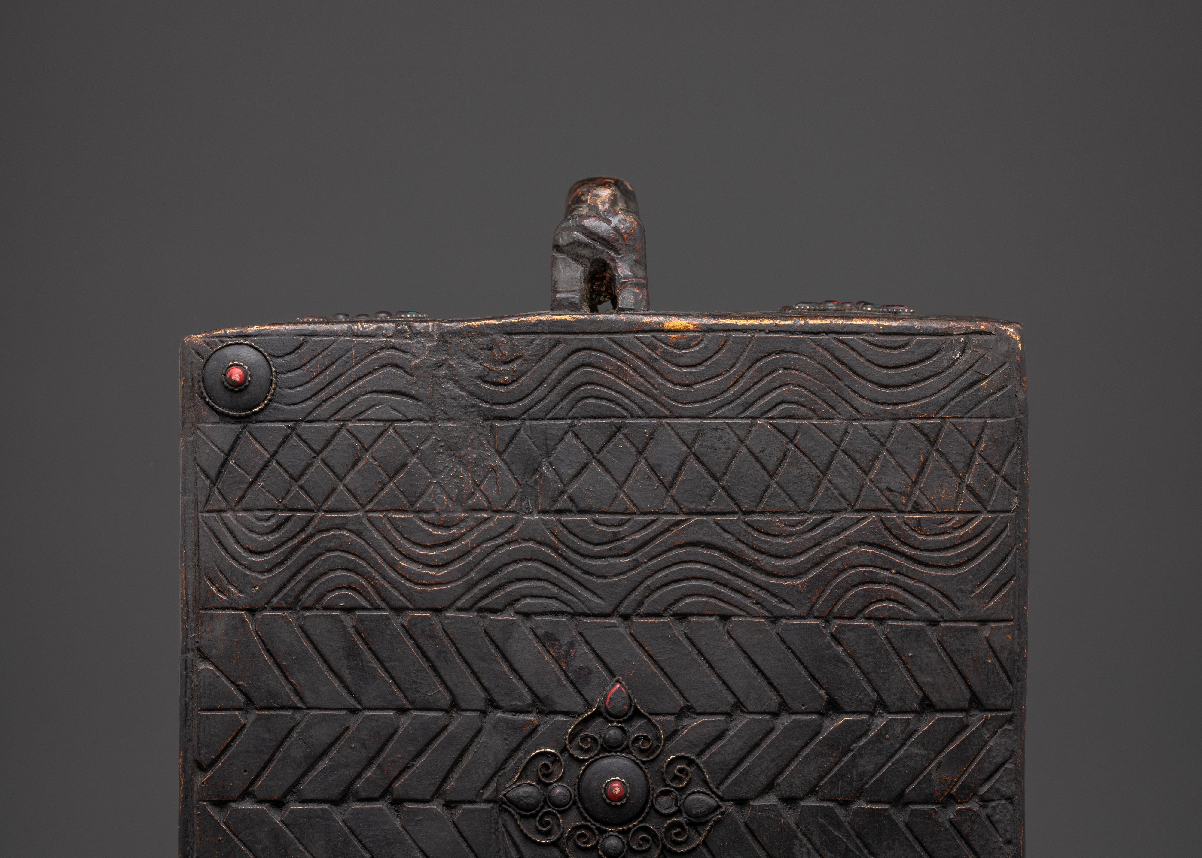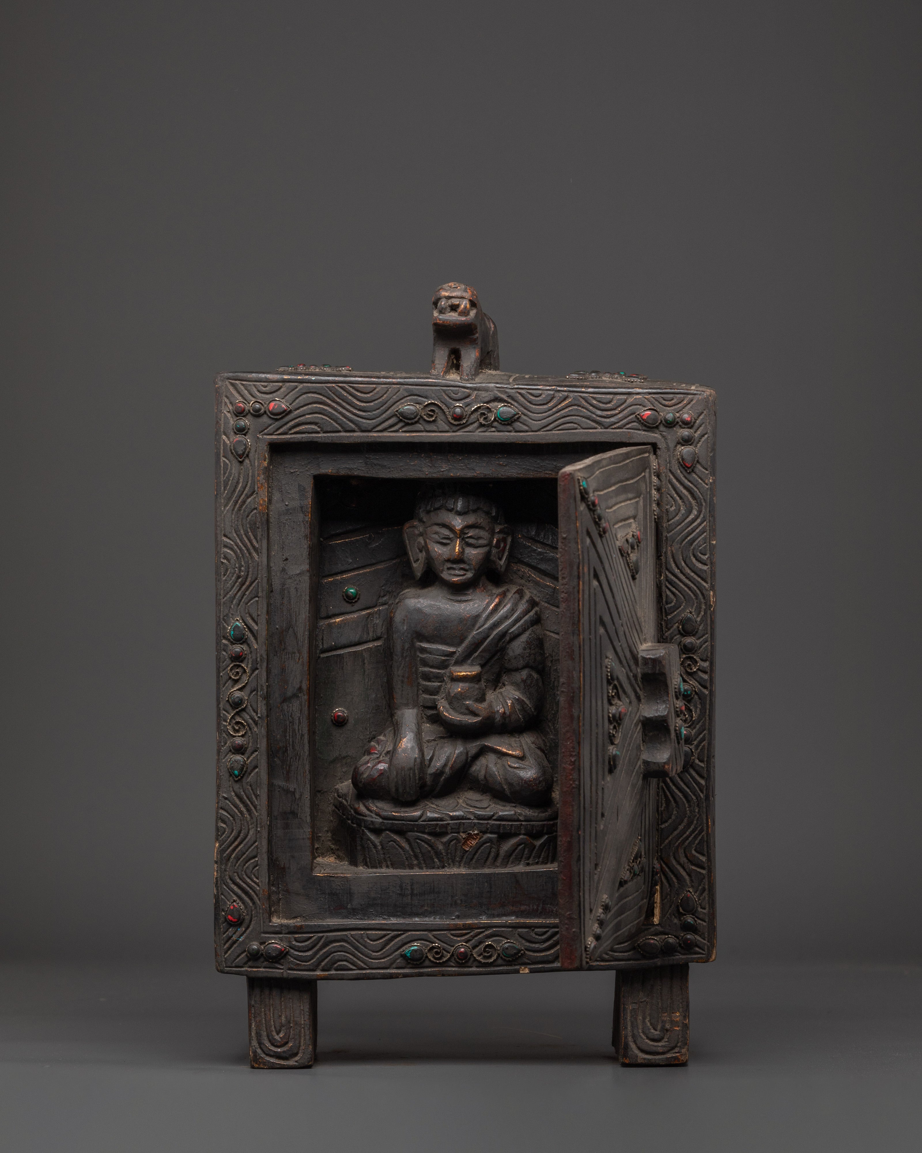 Opening the shrine reveals a beautifully carved image of Shakyamuni Buddha, seated in a calm meditation posture. The Buddha holds the alms bowl, a sign of compassion, wisdom, and the renunciation of worldly attachments. His serene expression radiates peace and spiritual clarity. The shrine’s door panels feature wave-like and lotus-inspired motifs that echo Tibetan artistry, guiding the eye inward to the sacred figure within.