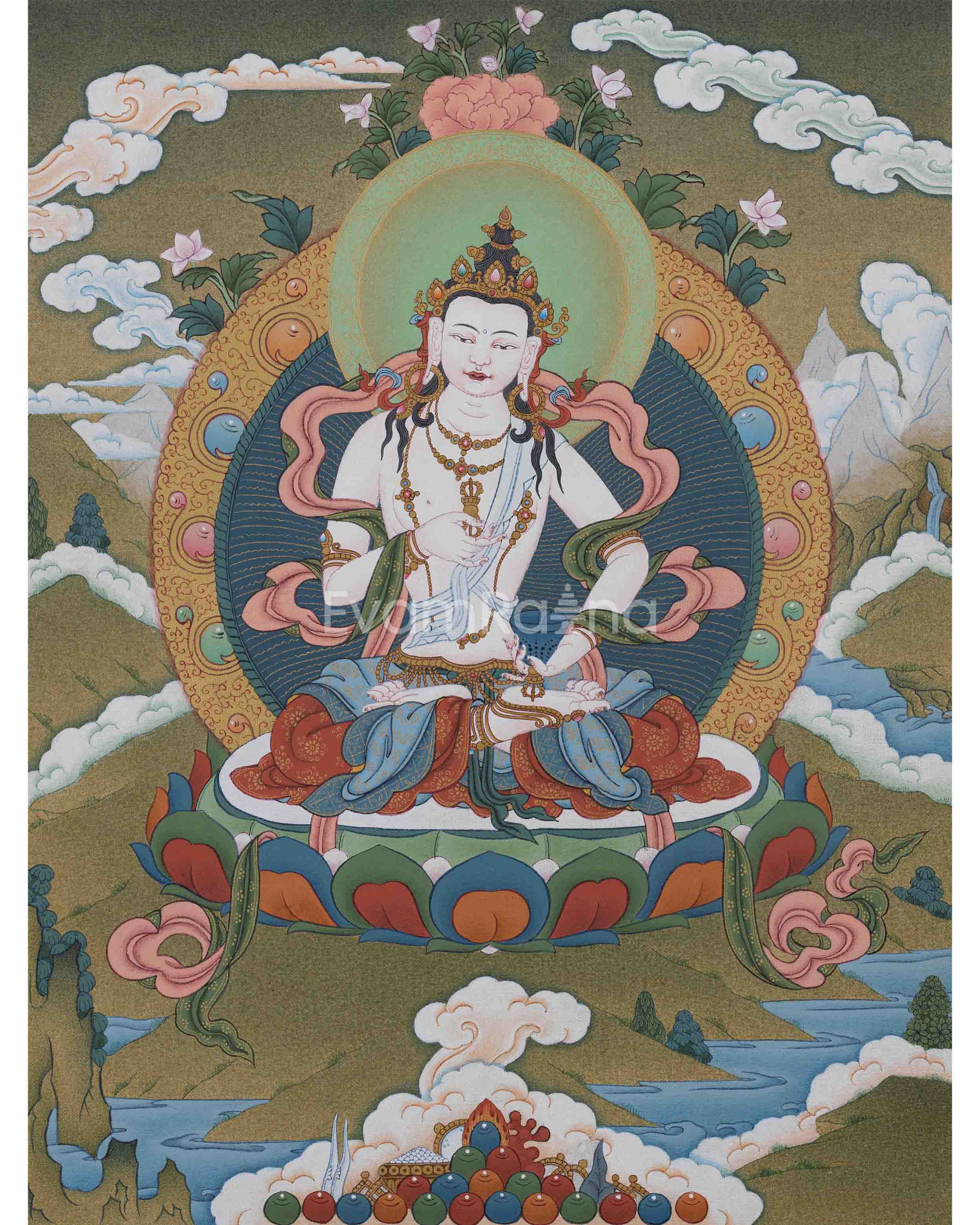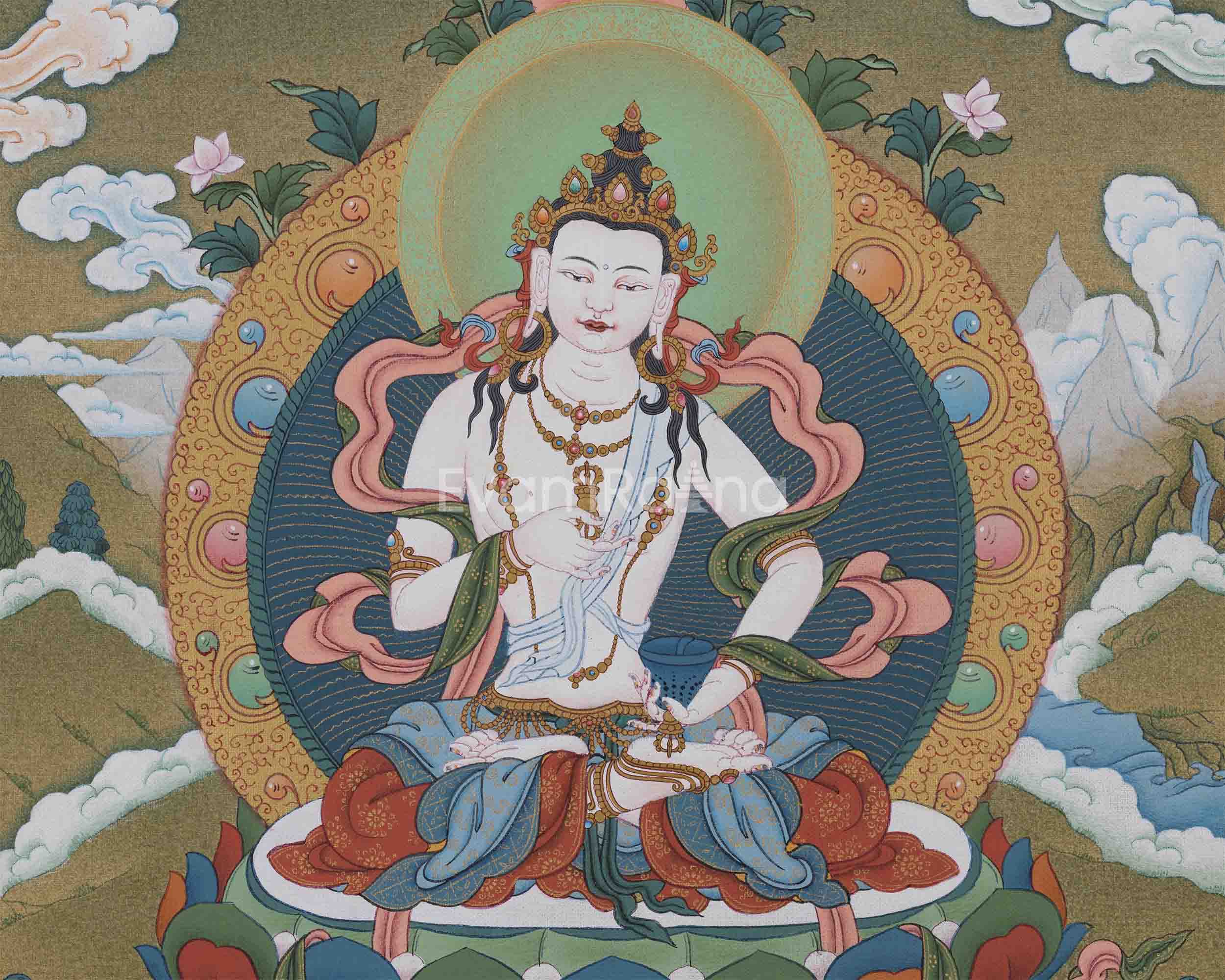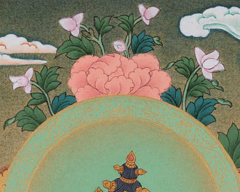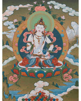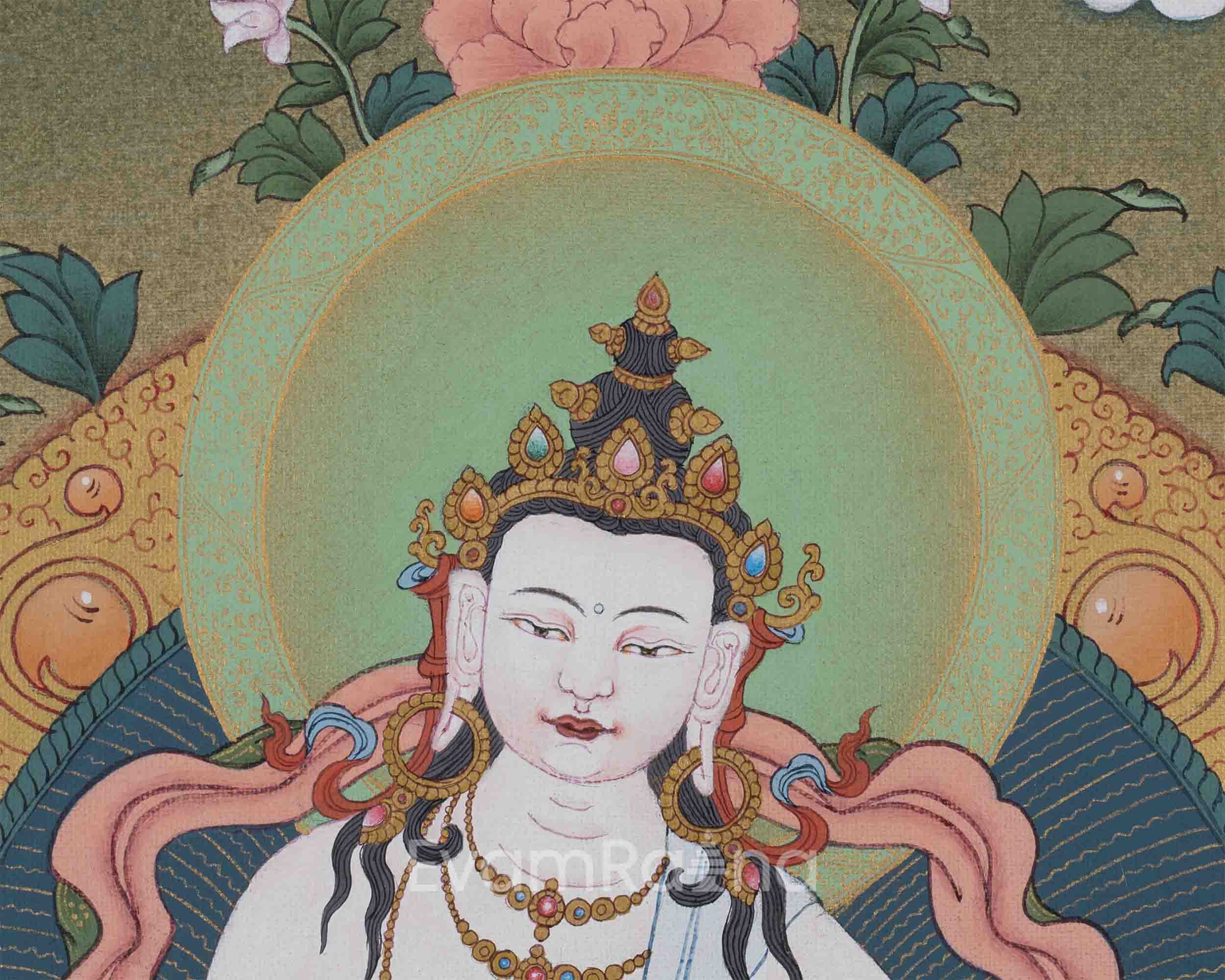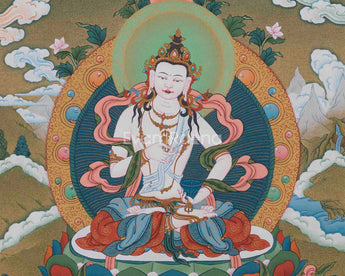 Our hand-painted Vajrasattva Thangka on a luscious cotton canvas is a testament to the fusion of artistic mastery and spiritual significance. Meticulously crafted with acrylic colors, the Thangka showcases a vibrant and dynamic representation of Vajrasattva, the embodiment of purification and enlightenment. Each brushstroke carries the artist's devotion, capturing the divine essence with precision and authenticity. What distinguishes this masterpiece is the infusion of genuine 24K gold, lending a luxurious and sacred radiance to the artwork. The use of acrylic colors allows for a rich palette, highlighting the intricate details of Vajrasattva's presence. The inclusion of 24K gold not only adds opulence but also symbolizes the transcendental qualities associated with this revered deity. Our hand-painted Vajrasattva Thangka serves as a visual portal to purification and spiritual transformation, inviting viewers to immerse themselves in the radiant beauty and profound teachings embodied by this sacred art.