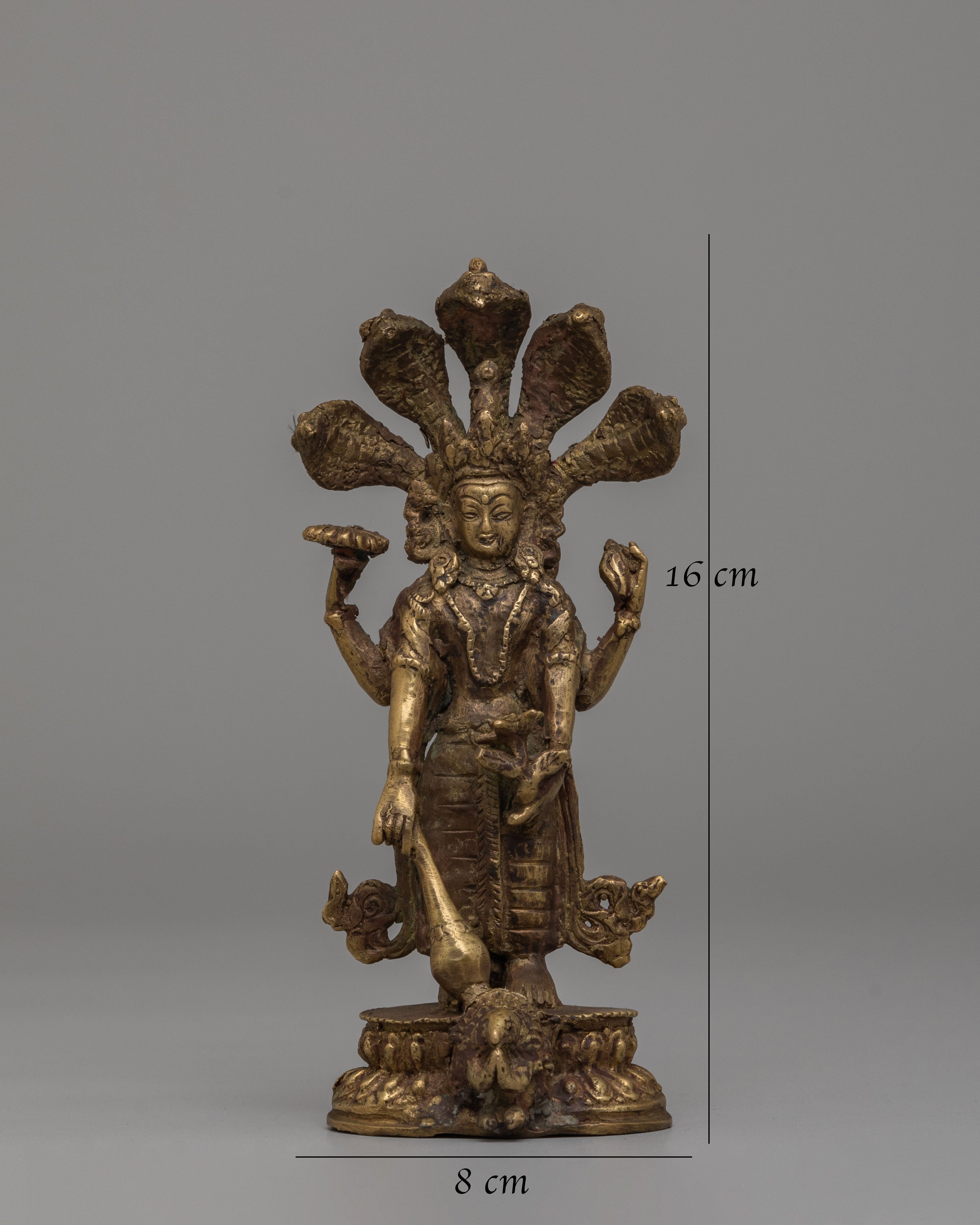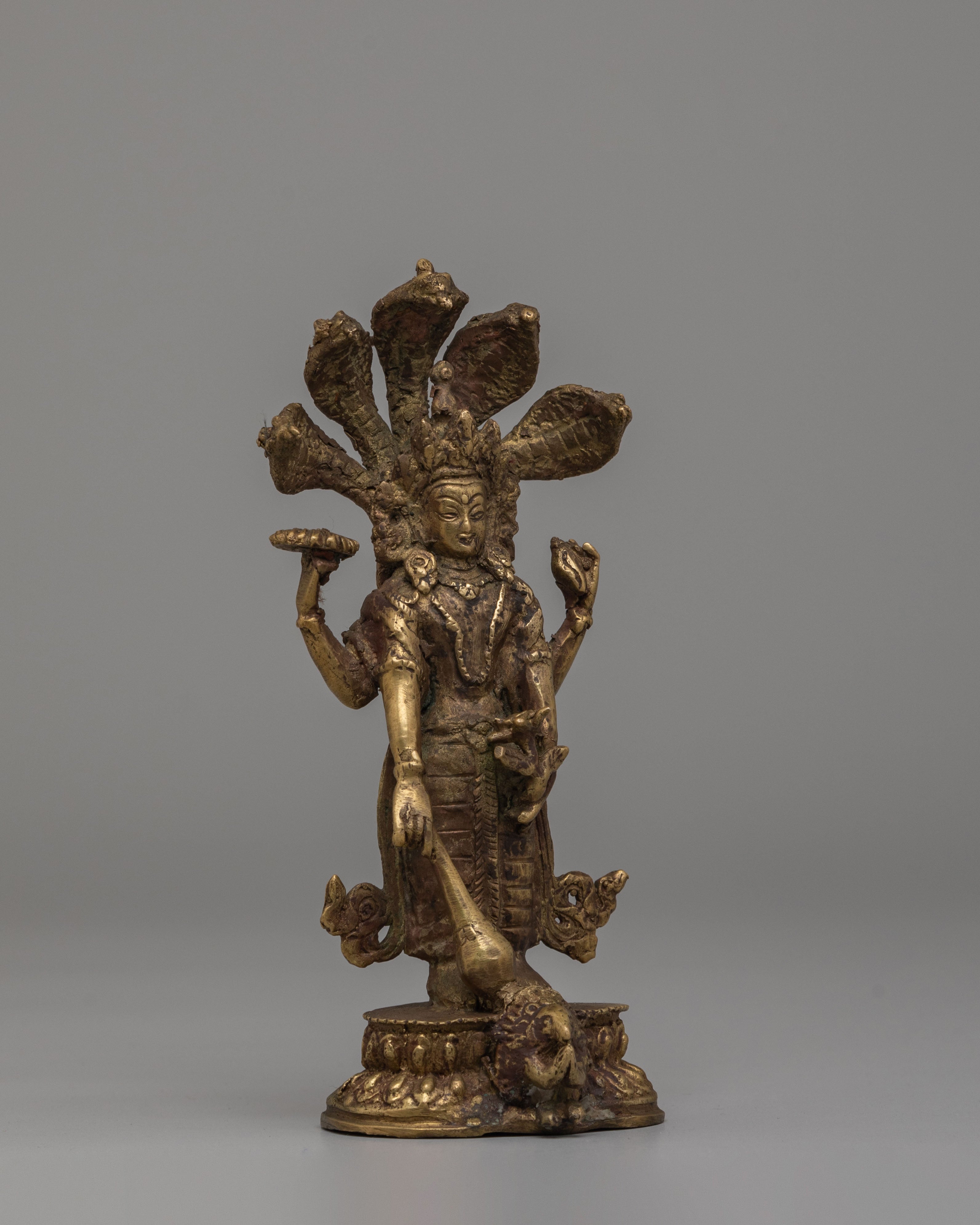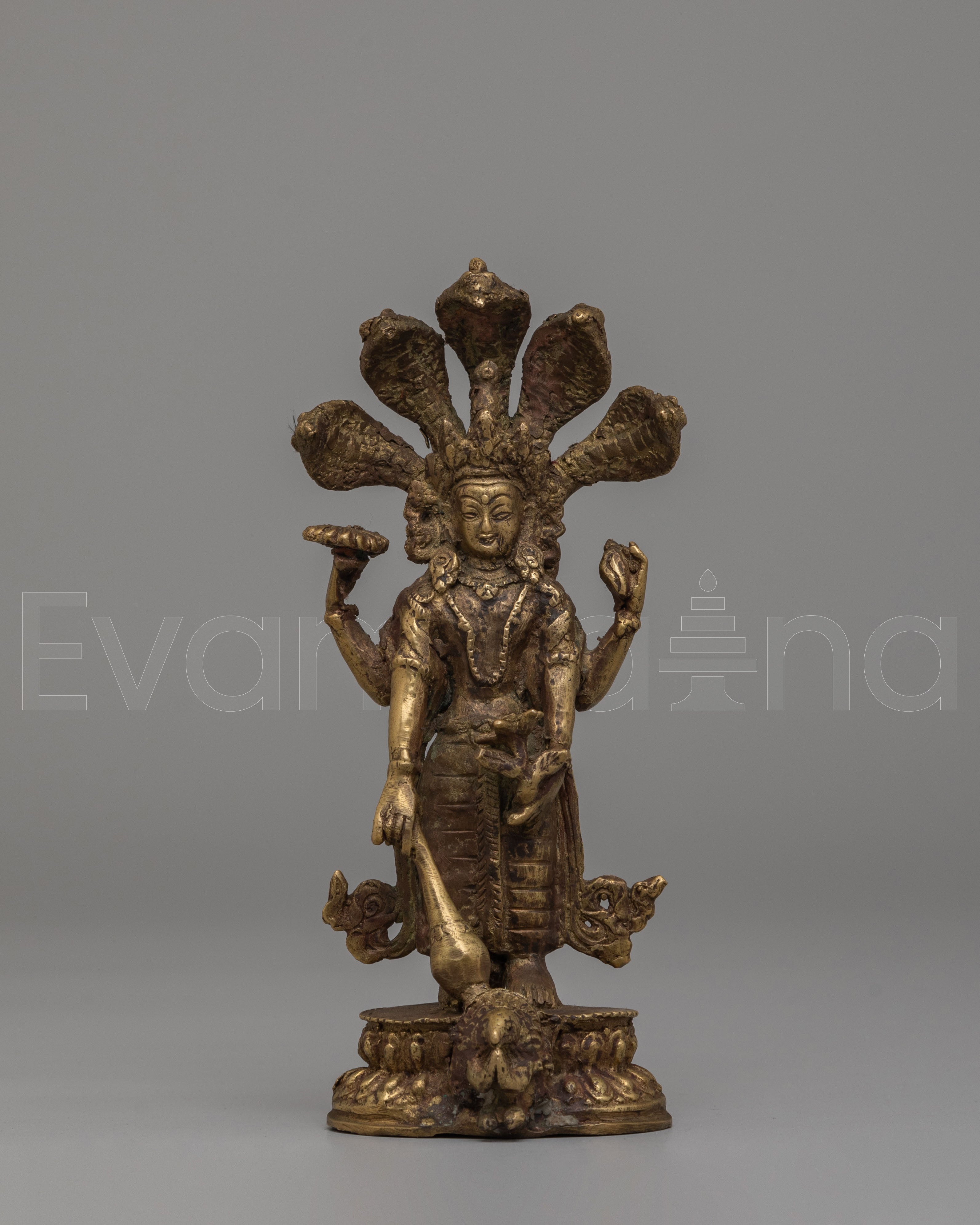 The Sacred Vishnu Statue is a stunning representation of Vishnu, one of the principal deities in Hinduism, embodying preservation, protection, and the cosmic order. This beautifully handcrafted statue is made from bronze and finished with an antique patina, giving it an elegant, timeless appearance. Vishnu is depicted with seven heads forming a divine crown, symbolizing his omnipotent and omniscient nature. In his four hands, Vishnu holds symbols that represent his divine powers: the conch, discus, mace, and lotus. This intricately designed statue is perfect for any altar, meditation space, or as a collector’s item.