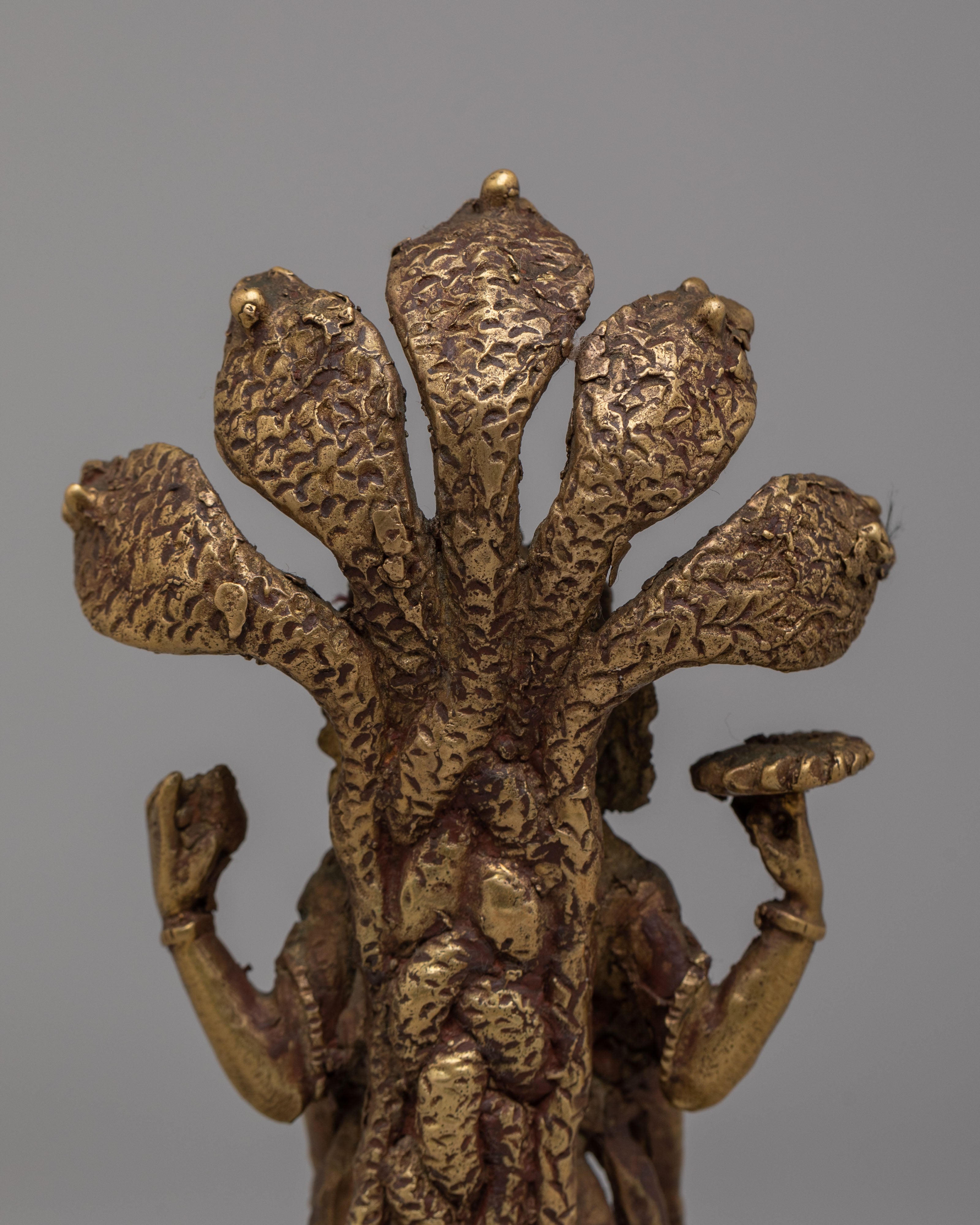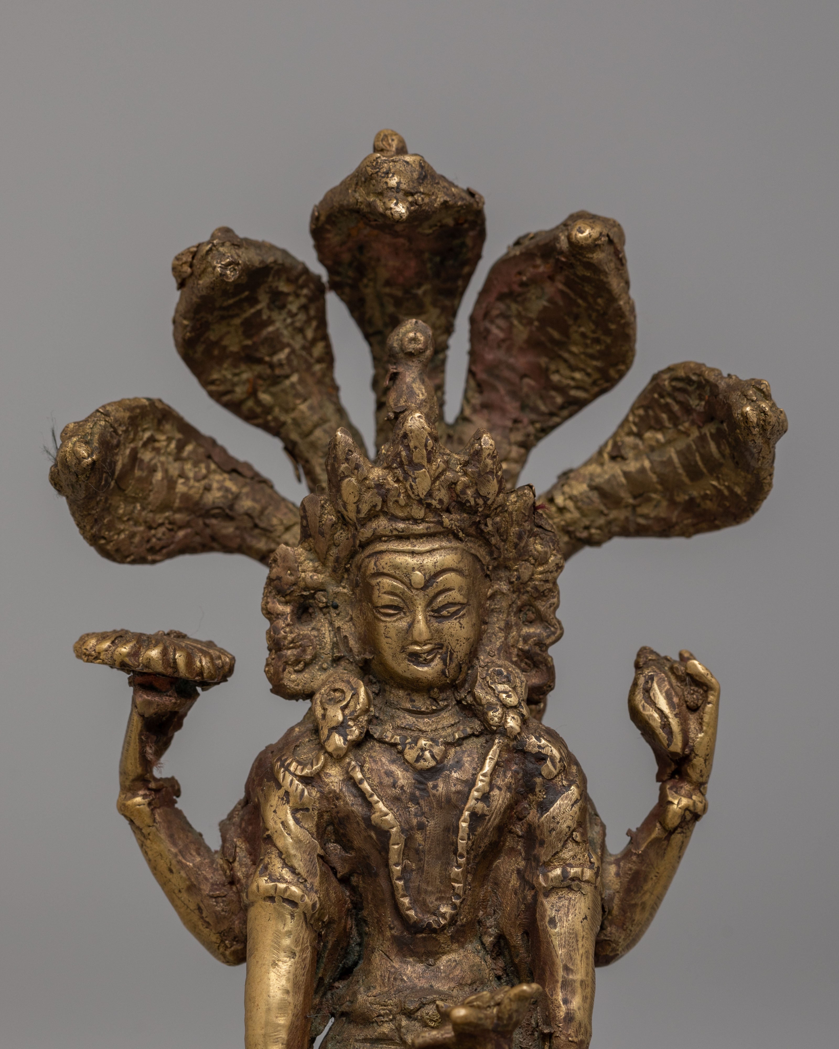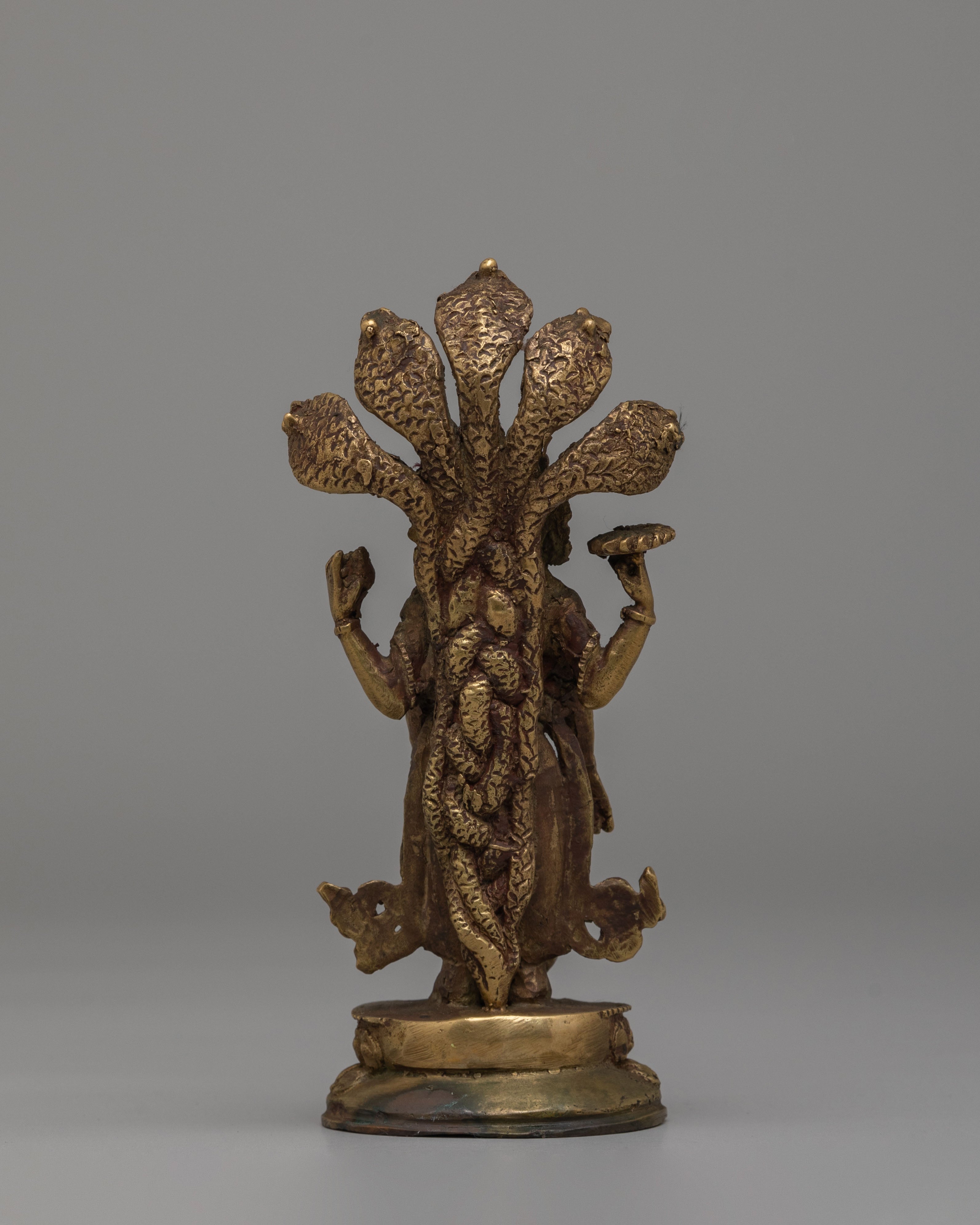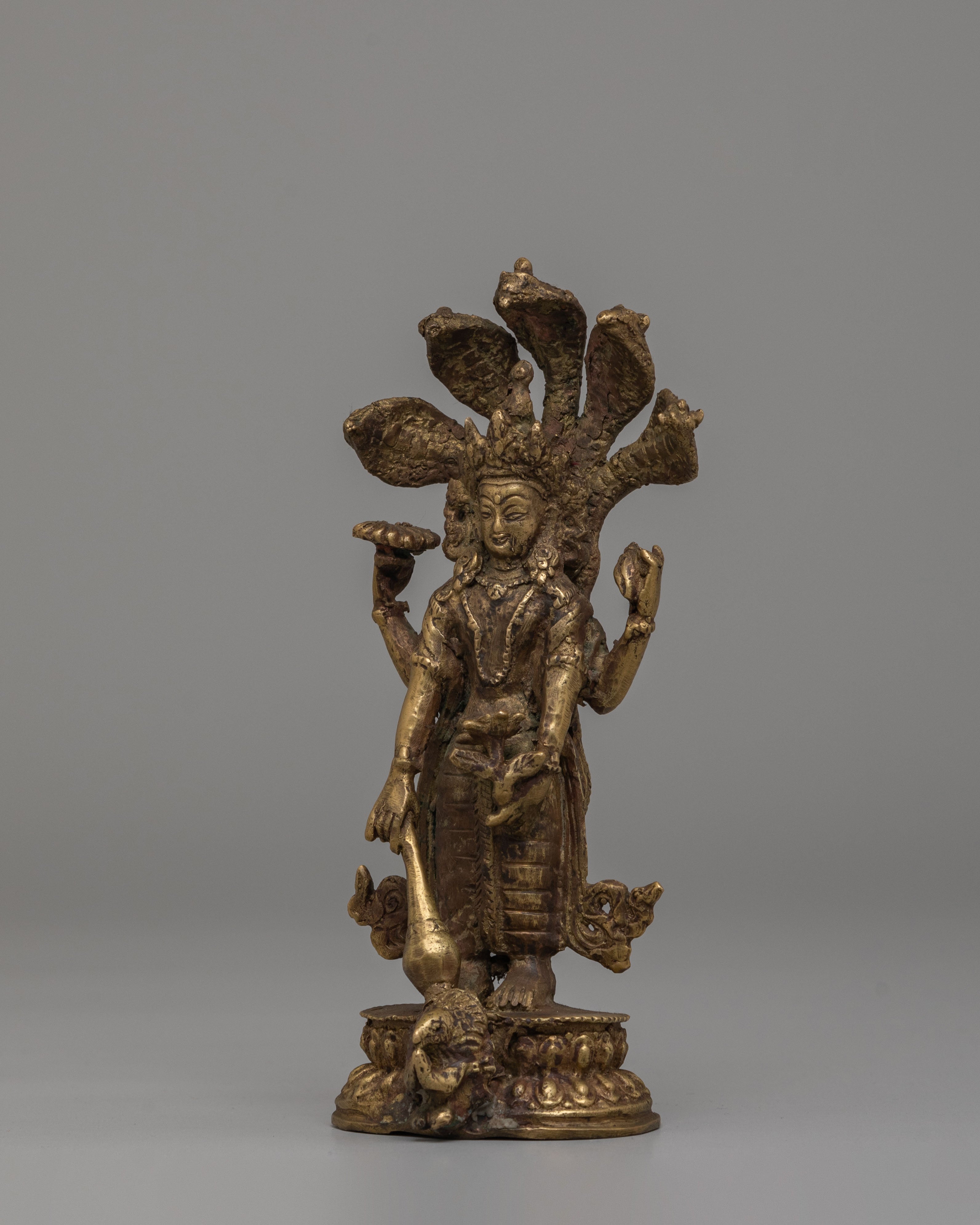 The Sacred Vishnu Statue is a stunning representation of Vishnu, one of the principal deities in Hinduism, embodying preservation, protection, and the cosmic order. This beautifully handcrafted statue is made from bronze and finished with an antique patina, giving it an elegant, timeless appearance. Vishnu is depicted with seven heads forming a divine crown, symbolizing his omnipotent and omniscient nature. In his four hands, Vishnu holds symbols that represent his divine powers: the conch, discus, mace, and lotus. This intricately designed statue is perfect for any altar, meditation space, or as a collector’s item.