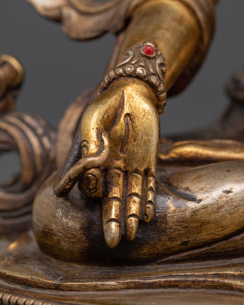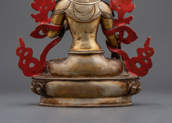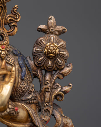Invite the peaceful and compassionate aura of the Sacred White Tara Buddha Statue into your house. Made from copper and embellished with acrylic paints and 24K gold gilding. The sculpture has an antique polish, rich details, and elaborate embellishments that accentuate its beauty and give it a timeless quality.