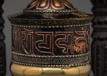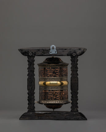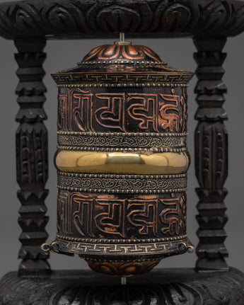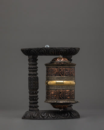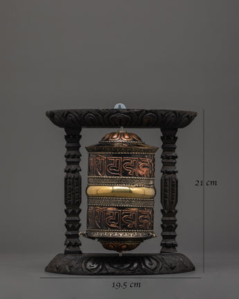 Sacred Wooden Framed Prayer Wheel | Copper and Brass Tibetan Mantra Wheel