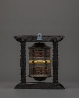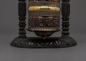 The prayer wheel revolves smoothly within its wooden frame, offering an internal exercise that symbolizes the Dharma's perpetual cycle.  Brass detailing adds a touch of spiritual elegance and enduring beauty.  This prayer wheel is ideal for individuals seeking inner serenity, practicing regular mantra recitation, or adding meaningful Buddhist decor to their space. It is a timeless tool for mindfulness and sacred aesthetics.