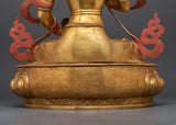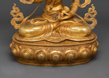 Expert craftspeople in Patan, Nepal—a province known for its superb craftsmanship and spiritual artistry—carefully handcraft this extraordinary sculpture. The statue has a strong copper body that is generously plated in 24K gold, giving it a luminous, heavenly radiance. The detailed aspects of Vajrasattva, such as his tranquil expression, majestic posture, and the symbolic things he holds, which reflect his ultimate spiritual power, are enhanced by the elaborate paintings in gold and acrylic. The statue is further embellished with hand-set gemstones, which give this eye-catching sculpture more depth and brilliant colors.
