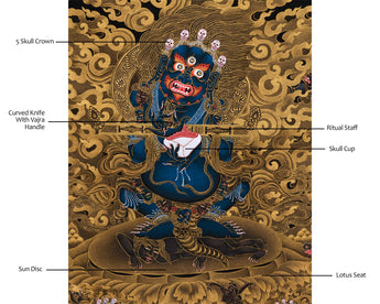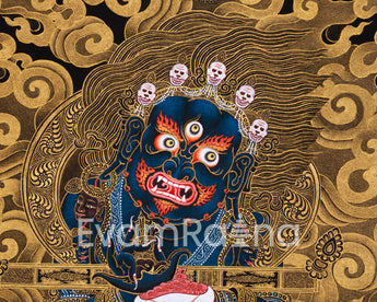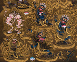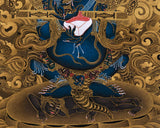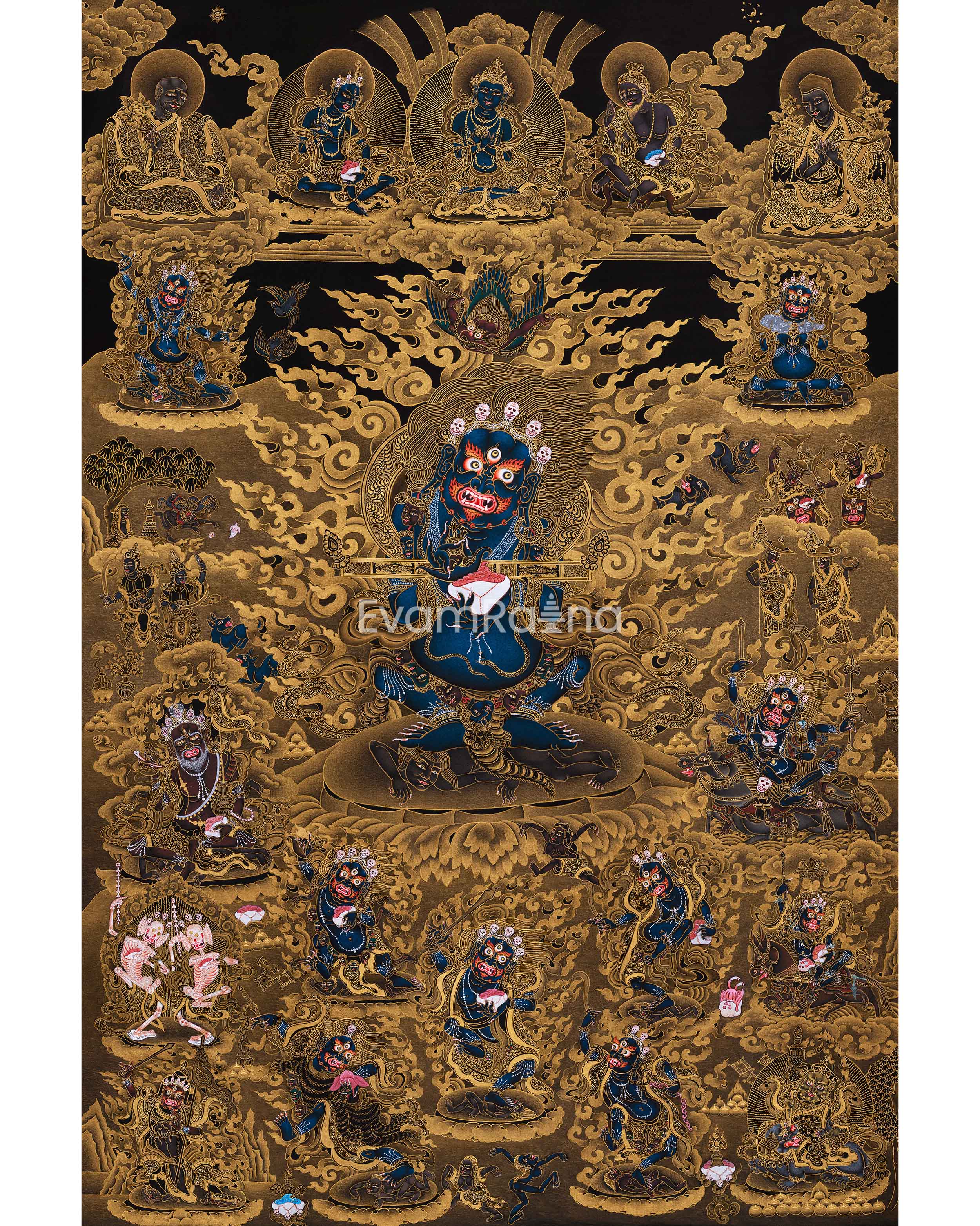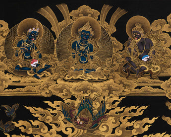 Indulge in the majestic allure of our Sakya Mahakala with Retinue Thangka, meticulously crafted in pure gold artistry. Sakya Mahakala, the fierce protector deity, stands at the forefront surrounded by his retinue, exuding an aura of awe-inspiring power and divine protection. Each intricate detail, rendered in shimmering gold, captures the essence of this sacred ensemble, transporting you into the realm of ancient wisdom and spiritual strength. Display this masterpiece in your sacred space and immerse yourself in the transformative energy of Sakya Mahakala, as he guides you fearlessly through the trials of life towards ultimate liberation.