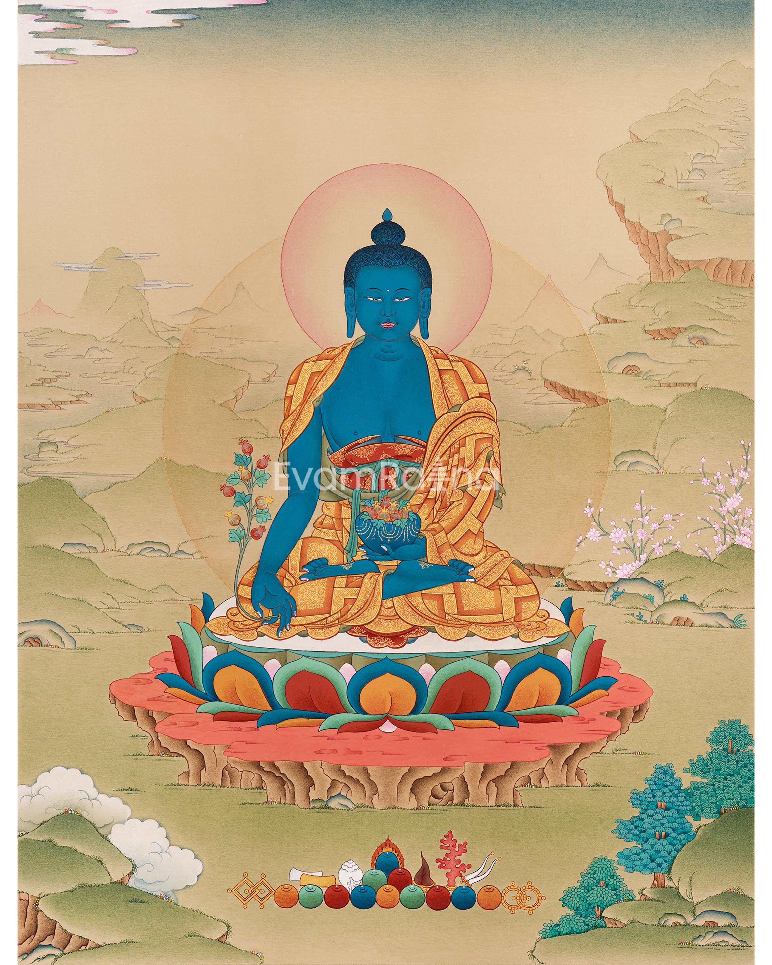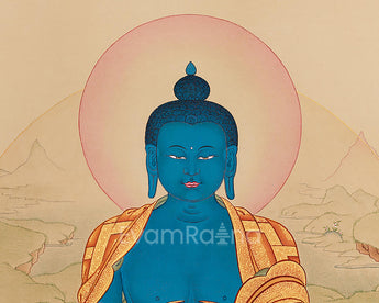 Immerse yourself in the profound healing energy of Sangay Menla, the Medicine Buddha, with this meticulously created Thangka. Sangay Menla is revered in Tibetan Buddhism as the Supreme Healer, embodying the healing power of all Buddhas. His deep blue body, radiating with the color of lapis lazuli, symbolizes the ultimate nature of healing—calm, compassionate, and boundless. In this Thangka, Sangay Menla is depicted holding a bowl of medicinal nectar in his left hand and the myrobalan plant in his right, both symbols of his ability to cure all forms of suffering, whether physical, mental, or spiritual.