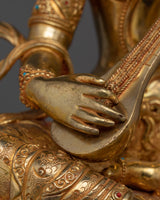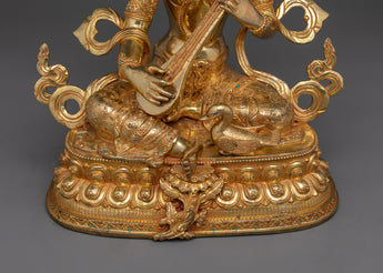 The intricate patterns on Saraswati's robes and the expressive features on her face and hands are just a few examples of the careful detail that went into creating this statue. The sculpture has been given elegance and spiritual meaning by the artists' thorough attention to detail. The gold plating highlights the artists' fine skills in addition to symbolizing Saraswati's spiritual essence. For individuals looking for a work of art that captures the spirit of inspiration and knowledge, this statue is ideal.