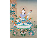 Saraswati Goddess depicts her serene nature with a kind face in the Thangka Art of Deity of Wisdom. She is seated on a lotus with a vina in her hand in a peaceful and floral environment. She's dressed in a long blue scarf with elaborate designs flowing across her body, bright clothing below her waist, and stunning expensive gems.