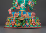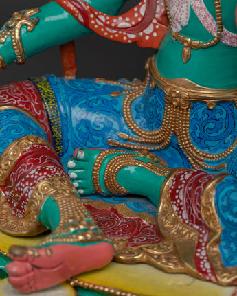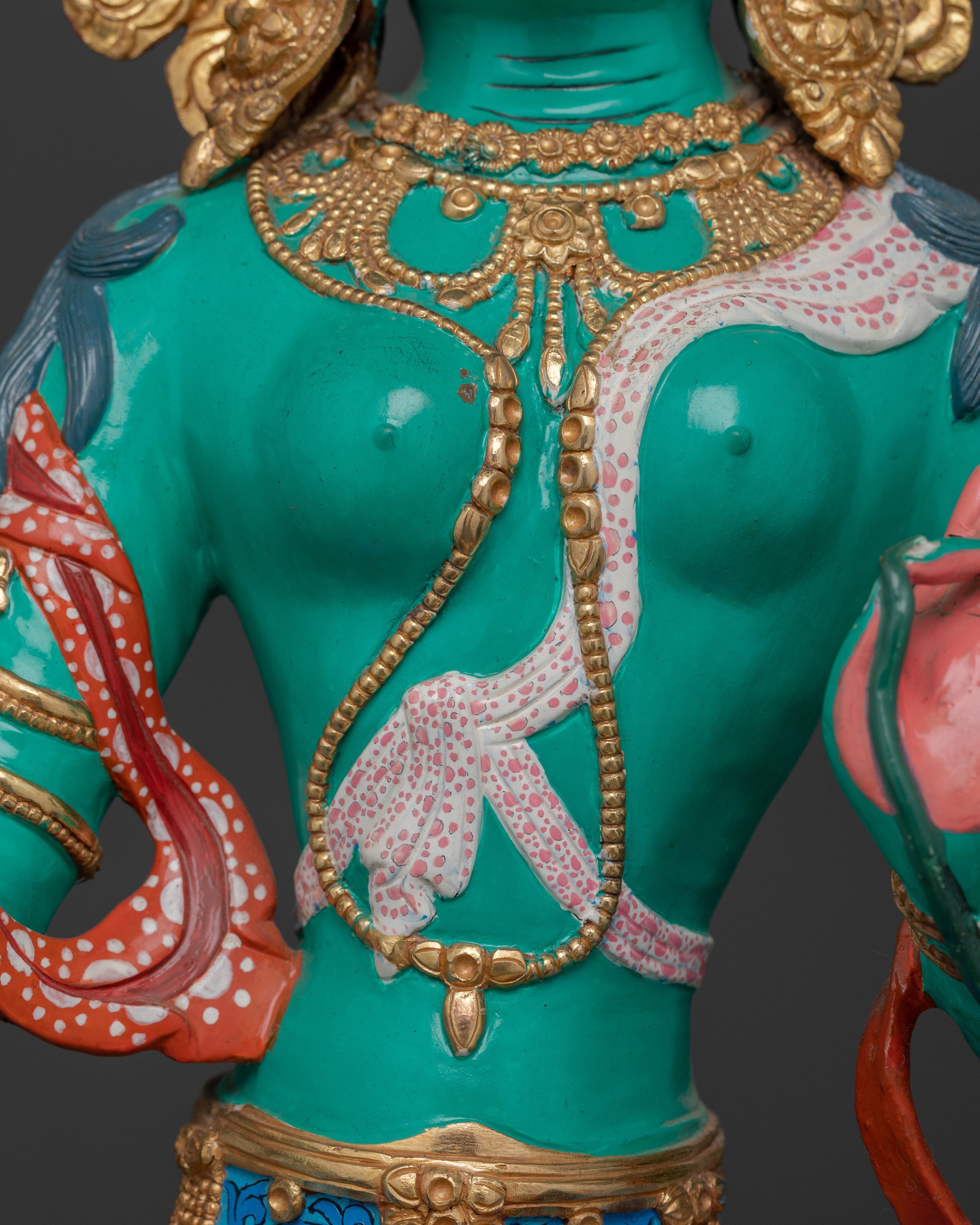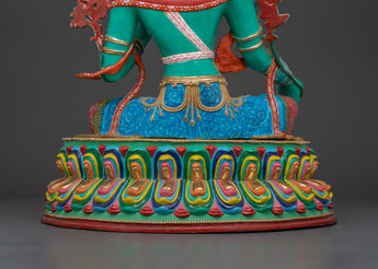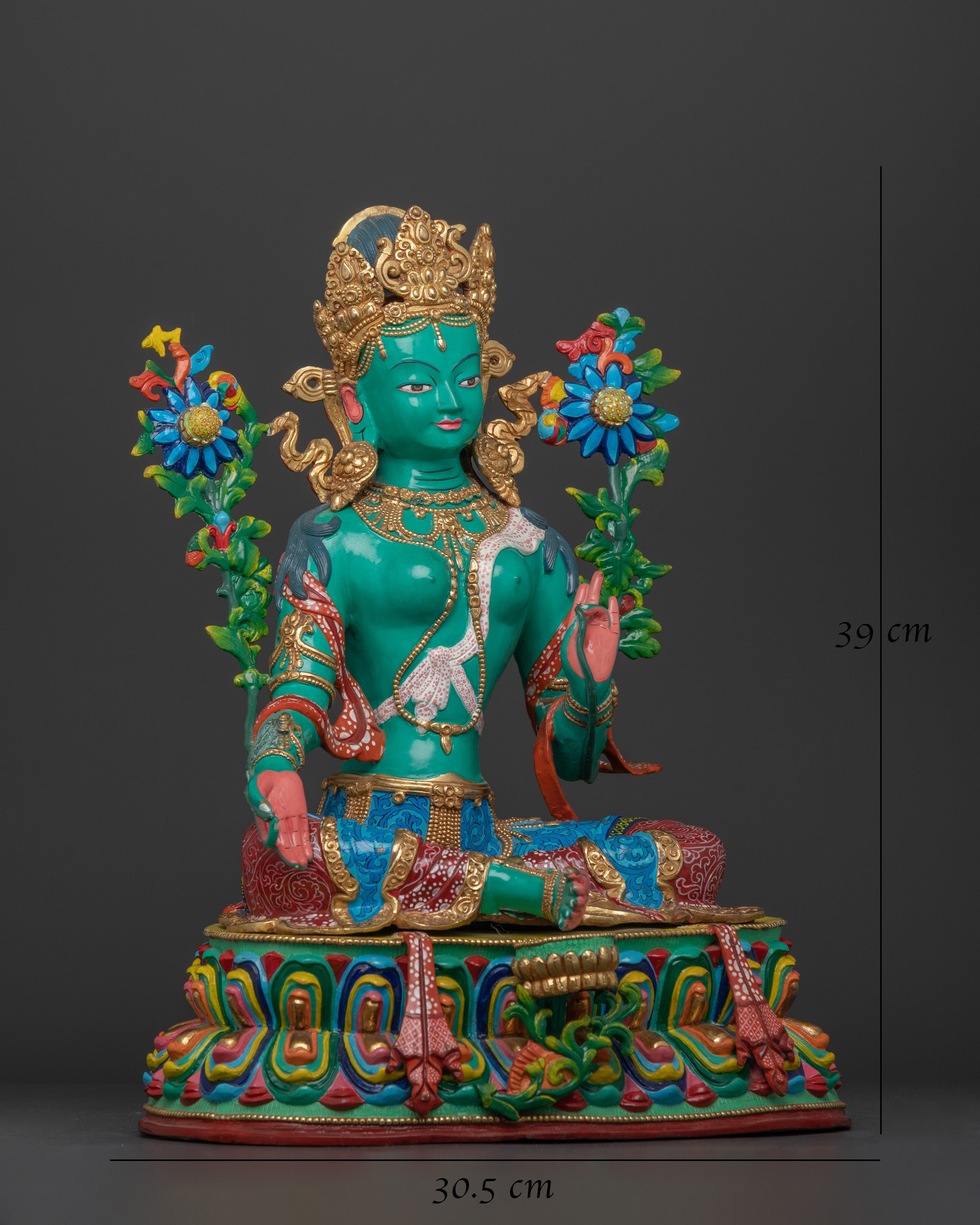 Savior Green Tara, a stunning statue that stands 15.4 inches (39 cm) tall, with a base width of 12 inches (30.5 cm), and weighs 7.40 kg. This magnificent pendant is expertly fashioned from 24K Gold Gilded Copper and embellished with delicate Acrylic Paintings. Green Tara represents fast compassion and protection, making her an important character in Buddhist practice.