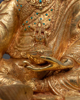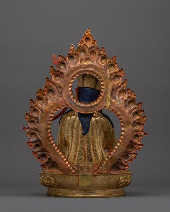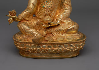 Guru Rinpoche is shown in a semi-wrathful position, holding a vajra (indestructible wisdom) in one hand and a kapala (skull cup) in the other, indicating the transmutation of obstacles. His furious visage and dynamic stance demonstrate his capacity to keep practitioners safe while guiding them through spiritual challenges. The flowing robes, hand-carved jewels, and beautiful gold details highlight his semi-wrathful appearance, which combines compassion and fierceness.
