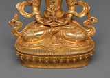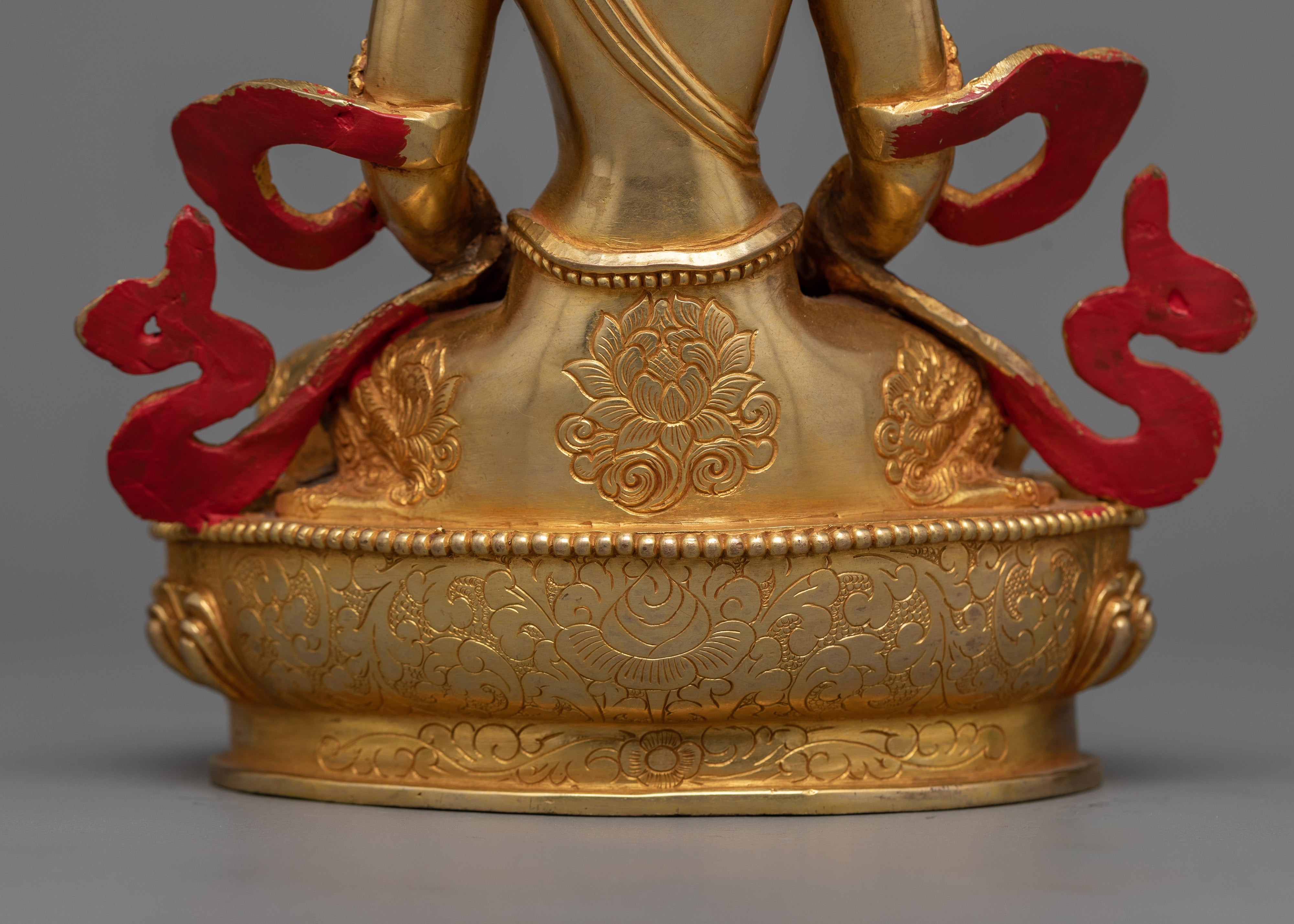 Amitayus represents endless life and profound understanding that surpasses the fleeting essence of life. He is frequently seen carrying the amrita, or nectar of immortality, on his lap. The statue’s exquisite detail, from the serene, contemplative expression of Amitayus to the intricate patterns on his robes, reflects the depth of his teachings and the profound peace that comes with realizing the impermanence of existence.