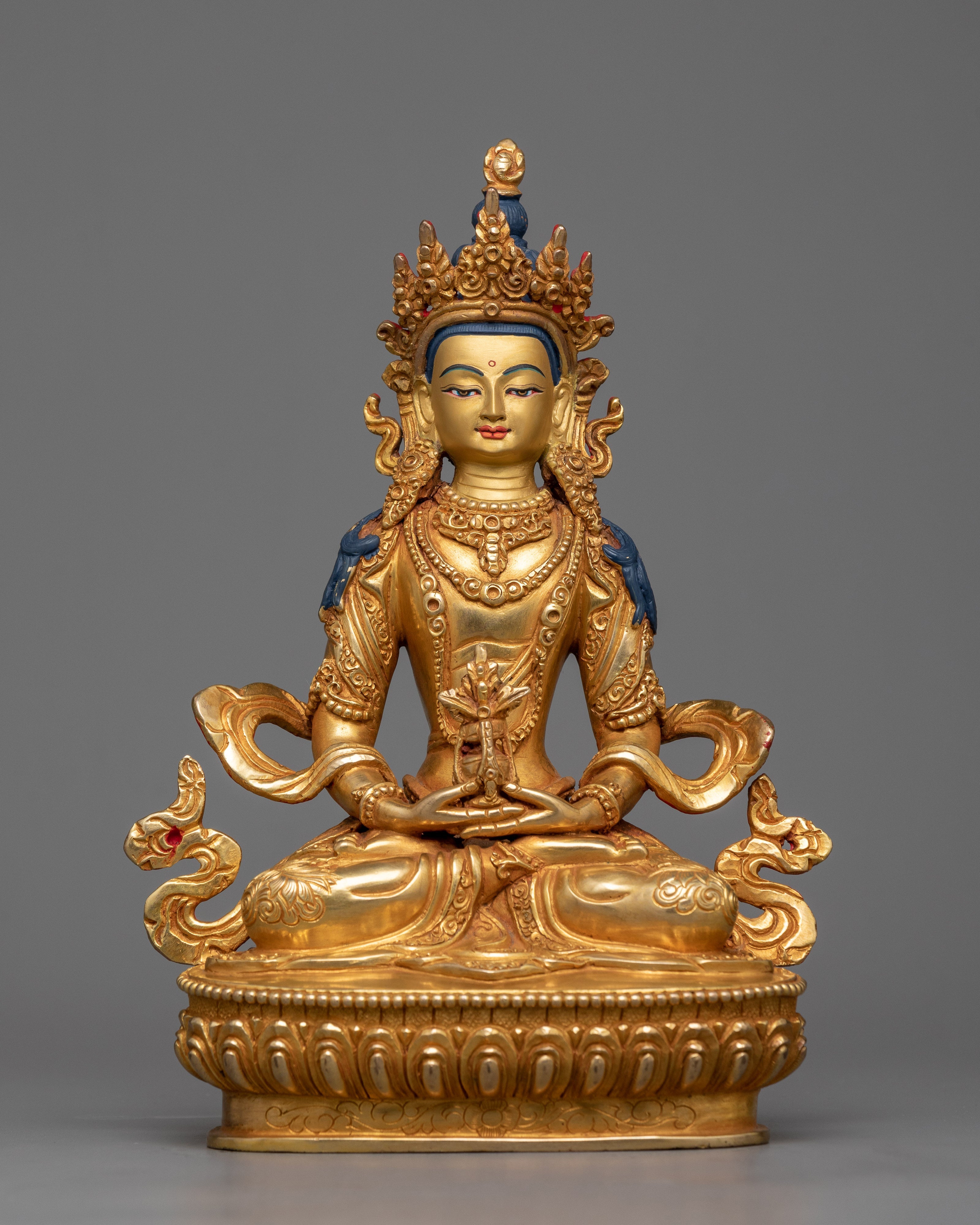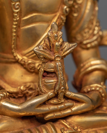 Presenting the statue of Amitayus, associated with longevity, health, and wisdom: the Serene Amitayus Buddha of Longevity. Standing at 8.6 inches, this finely constructed statue has a copper body richly embellished with 24K gold gilding and enhanced with paintings in gold and acrylic. At 1.37 kilograms, it embodies the blessings of longevity bestowed by Amitayus, capturing his serene majesty.