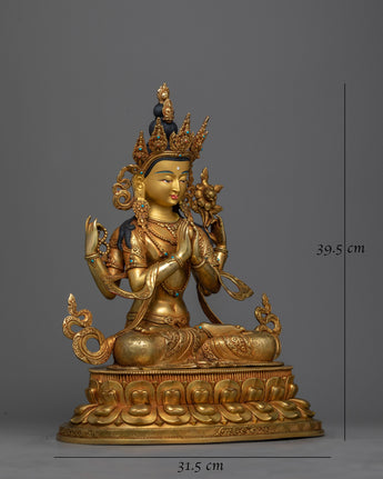 This Statue was made from copper by Patan artists using their age-old methods. After that, the statue is coated with 24K gold which gives it a dazzling sheen that represents the holiness and purity of Chenrezig's teachings. The statue gains depth and vitality from the gold and acrylic paintwork that accentuates its exquisite features.