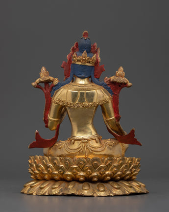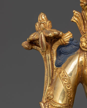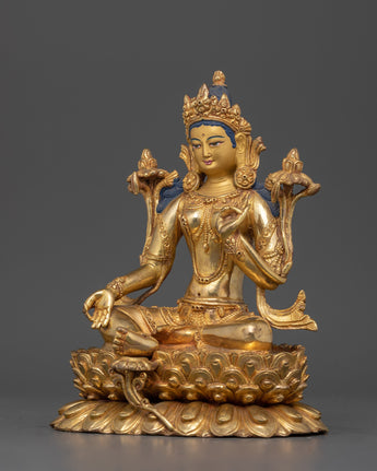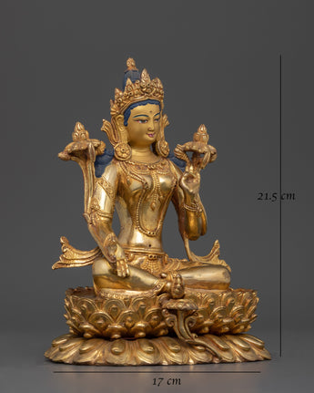 This magnificent Green Tara in Buddhism Statue, measuring 8.5 inches (21.5 cm) tall with a base width of 6.7 inches (17 cm), is a stunning work of art weighing 2.35 kg. This statue is meticulously created from a copper body and has 24K gold gilding as well as intricate gold and acrylic paintings that capture the calm and grace of Green Tara, a famous deity in Tibetan Buddhism.