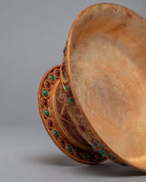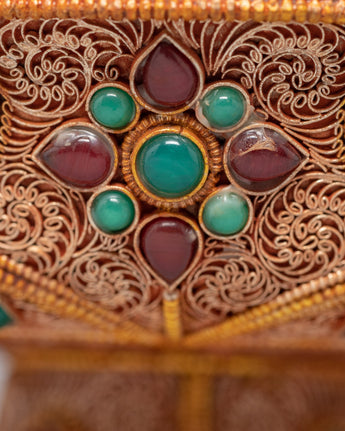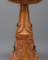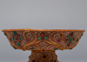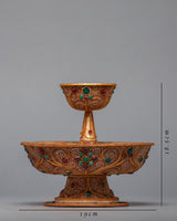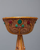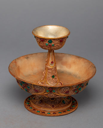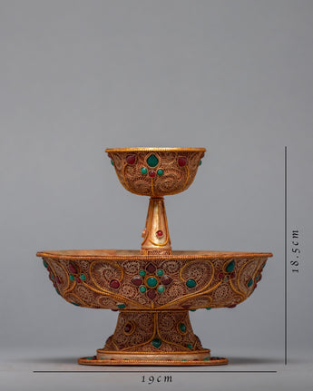 The Serkyem Offering set is meticulously handcrafted on a copper body. The gemstones are diligently inlaid, adding to the beauty and value of the set. The Serkyem Offering is a traditional Tibetan ritual in which a beverage of two liquids, usually water and alcohol, is offered to enlightened beings. The set includes two cups, one smaller and one larger, to represent the two liquids.