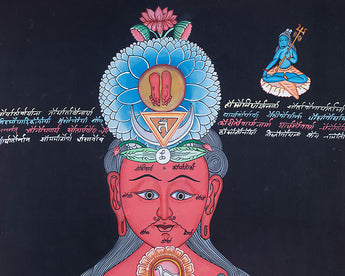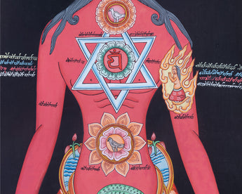 The Seven Chakra Kundalini Thangka powerfully illustrates the subtle energy system within the human body, central to both yogic and tantric traditions. This Kundalini Thangka is an exquisite demonstration of Tibetan artistic talent, made entirely by hand in the traditional method by a skilled Nepali artist. The base is made of high-quality cotton canvas, which is durable and suitable for detailed sacred art. Vivid acrylic colors are mixed to add clarity and intensity to each chakra symbol and energetic line, resulting in visual impact and symbolic precision.